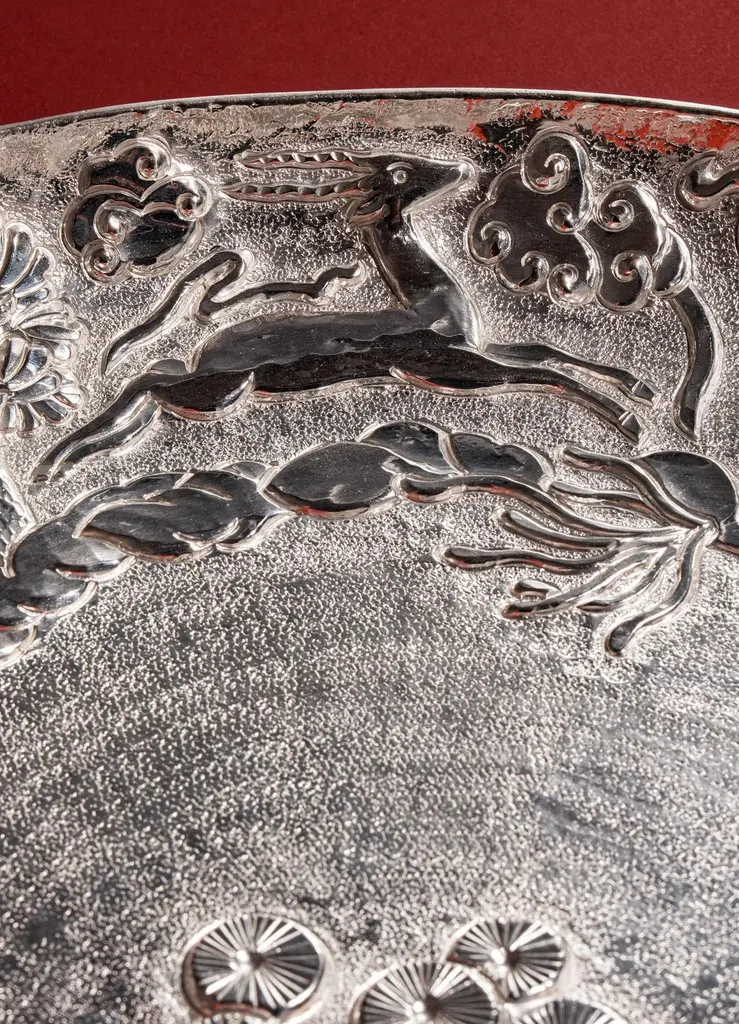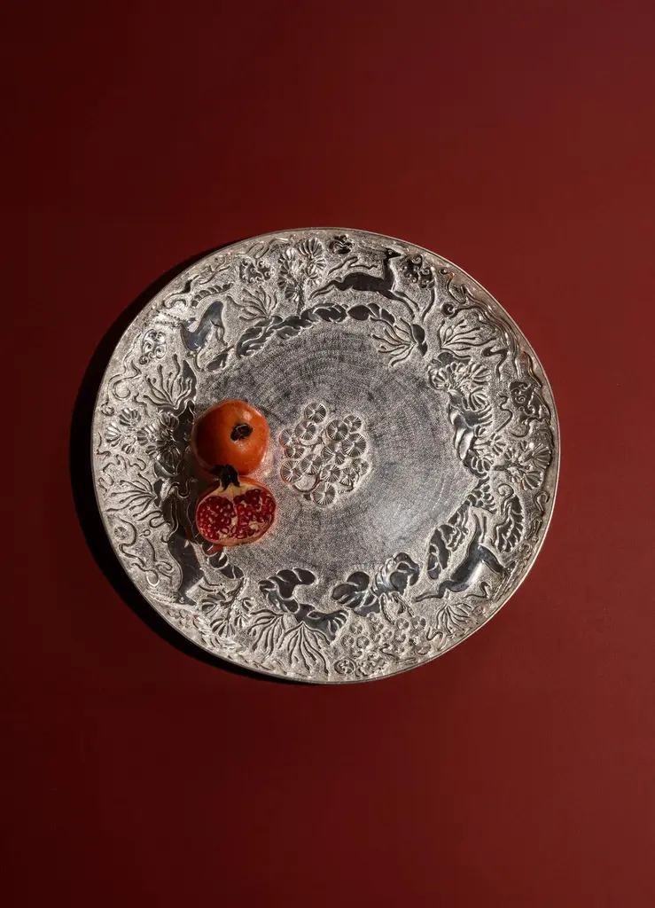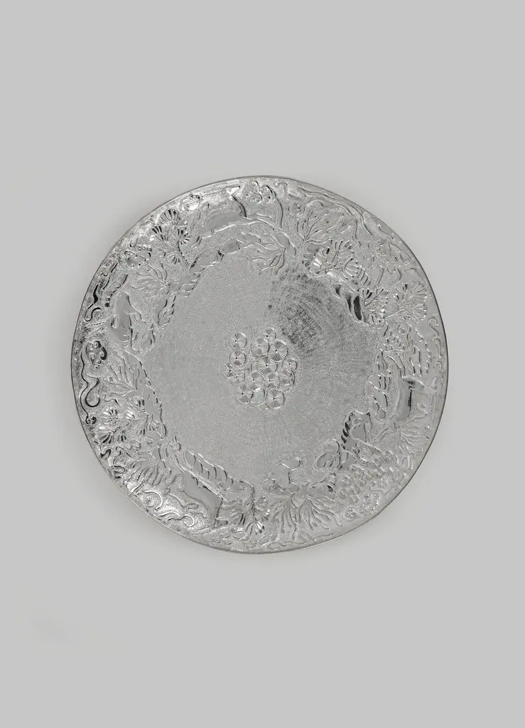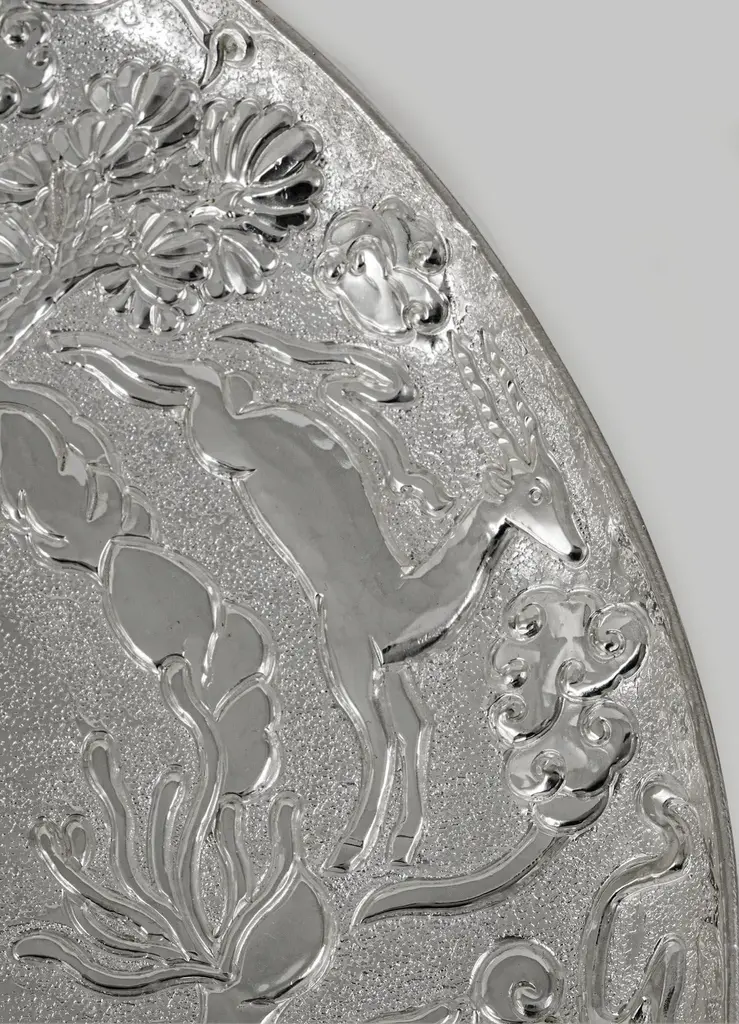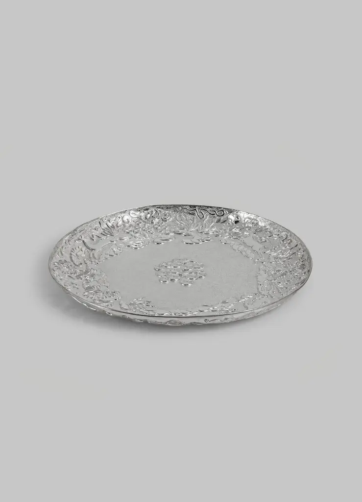 Blackbuck Silver Plated Round Platter in Brass, Viya by Vikram Goyal"Repoussé involves hammering low-relief designs into malleable metal sheets from the reverse that originated around the 3rd or 4th century B.C., in the Middle East. In India, the technique was traditionally used to make temple doors and ceilings with devotional themes. The studio explores this process through organic abstract patterns and also gives contemporary life to classical themes from the visual decorative arts. In order to achieve this, months are spent experimenting and sampling the detailed, time-consuming technique. The final outcome is a result of the synergy between designer and artisan: a detailed two-dimensional artwork is realised in sheet metal through the intuitive and skilled process of applying the right amount of pressure to elevate the forms."Platter in brass and silver. Handmade in India.Product DetailsMaterial: BrassSize: 15.5"DIA x 1"H 39.4 DIA x 2.5 H cmWeight: 1.8 kg 3.96 lbsNumber of Pieces: 1 PlatterSKU: VPT1601This product has been handcrafted by local artisans. As such, slight variations are a testament to the unique character of a piece made by hand.