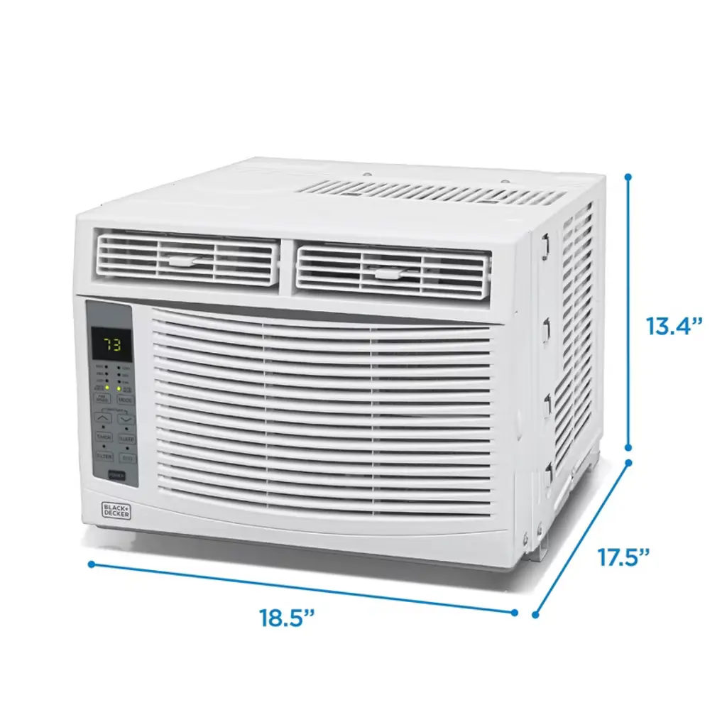 The BLACK+DECKER 6,000 BTU Window Air Conditioner offers a cooling solution designed for optimum comfort and efficiency. This window mounted AC is a perfect addition to your home, offering a powerful cooling capacity that can efficiently cool rooms up to 250 square feet. With an 11 CEER rating, this air conditioner is engineered for energy efficiency and sustainability, utilizing R-32 refrigerant to minimize environmental impact. The Black and Decker window air conditioner boasts an array of features tailored to enhance user convenience and comfort. Equipped with electronic controls and a digital display along with a full function remote control, adjusting your settings is straightforward and precise. This window AC unit is designed with versatility in mind, featuring three cooling and three fan speeds that can be adjusted to suit your preferences. The adjustable thermostat control provides a temperature range from 61 to 88 degrees Fahrenheit, allowing you to customize your environment for ultimate comfort. For added convenience, the unit includes a sleep mode and energy saver feature, promoting efficient operation and reducing energy consumption during non-peak hours. Installation is made simple with the included hardware and installation kit, accommodating windows that measure 23 to 34 inches in width and as low as 14.5 inches in height. The side accordion panels ensure a snug fit, minimizing air leaks and maximizing efficiency. The removable and washable filter simplifies maintenance, ensuring your air conditioner window unit remains in optimal working condition. Additional features such as the timer/clock function and auto restart enhance the functionality of this room air conditioner. The auto cooling/fan mode provides seamless operation, adapting to your cooling needs without manual intervention. In fan-only mode, you can enjoy a gentle breeze without the cooling effect. 115V, 60Hz, 6A. UL listed.