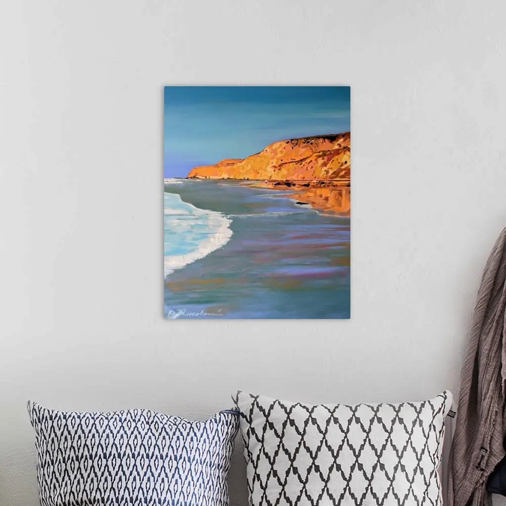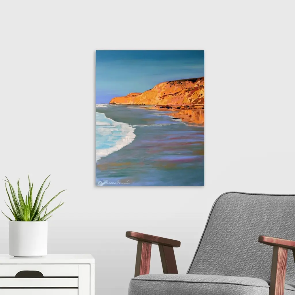 Blacks Beach Cliffs at Low Tide by RD Riccoboni. La Jolla San Diego, reflects into the shimmering sand beach as the waves roll in and out.