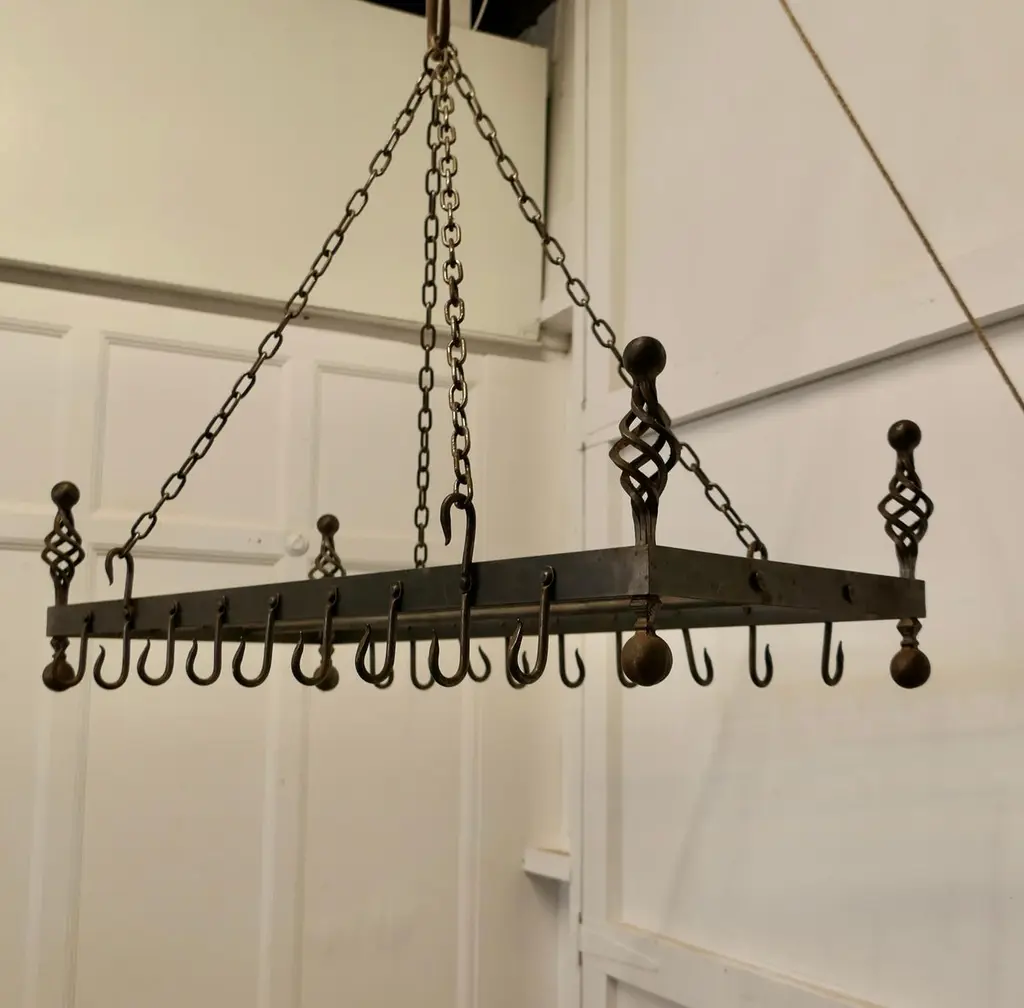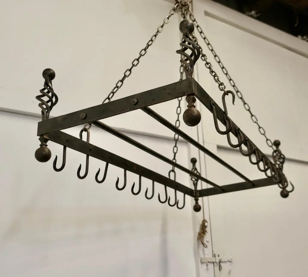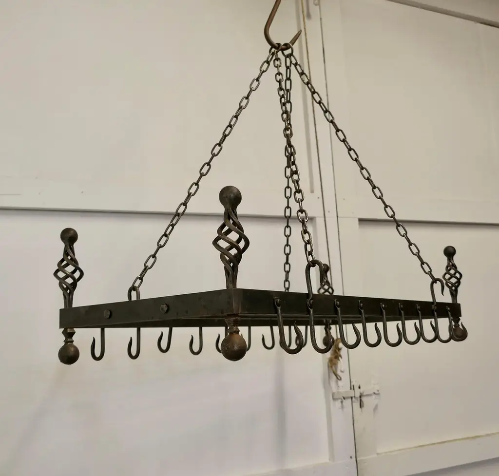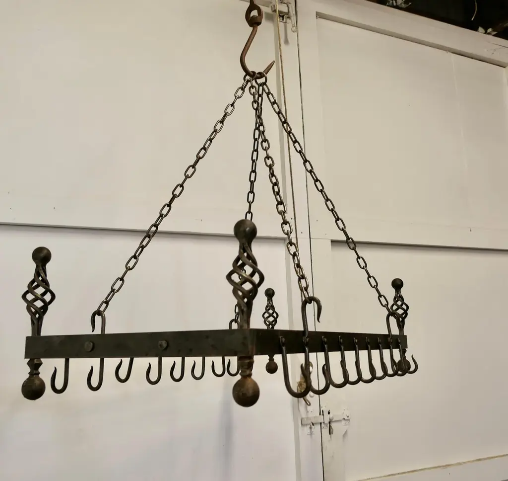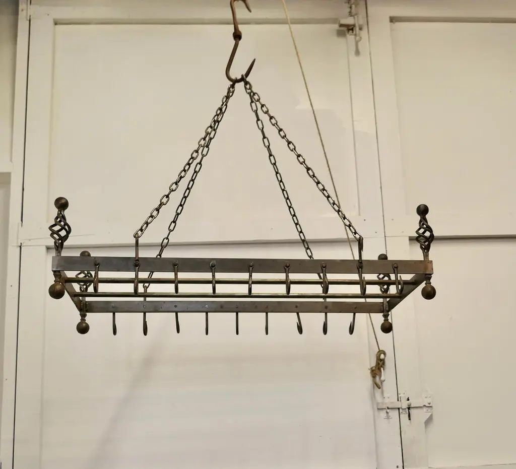 Blacksmith made iron game hanger, kitchen utensil or pot hanger.A great piece with lots of Character, it is a large rectangular piece it is set with 18 iron hooks, if you don’t need it to hang your game on how about your pots or kitchen utensils.The hanger is 22” x 42” 11” high or 31” including the chains.TJK179.