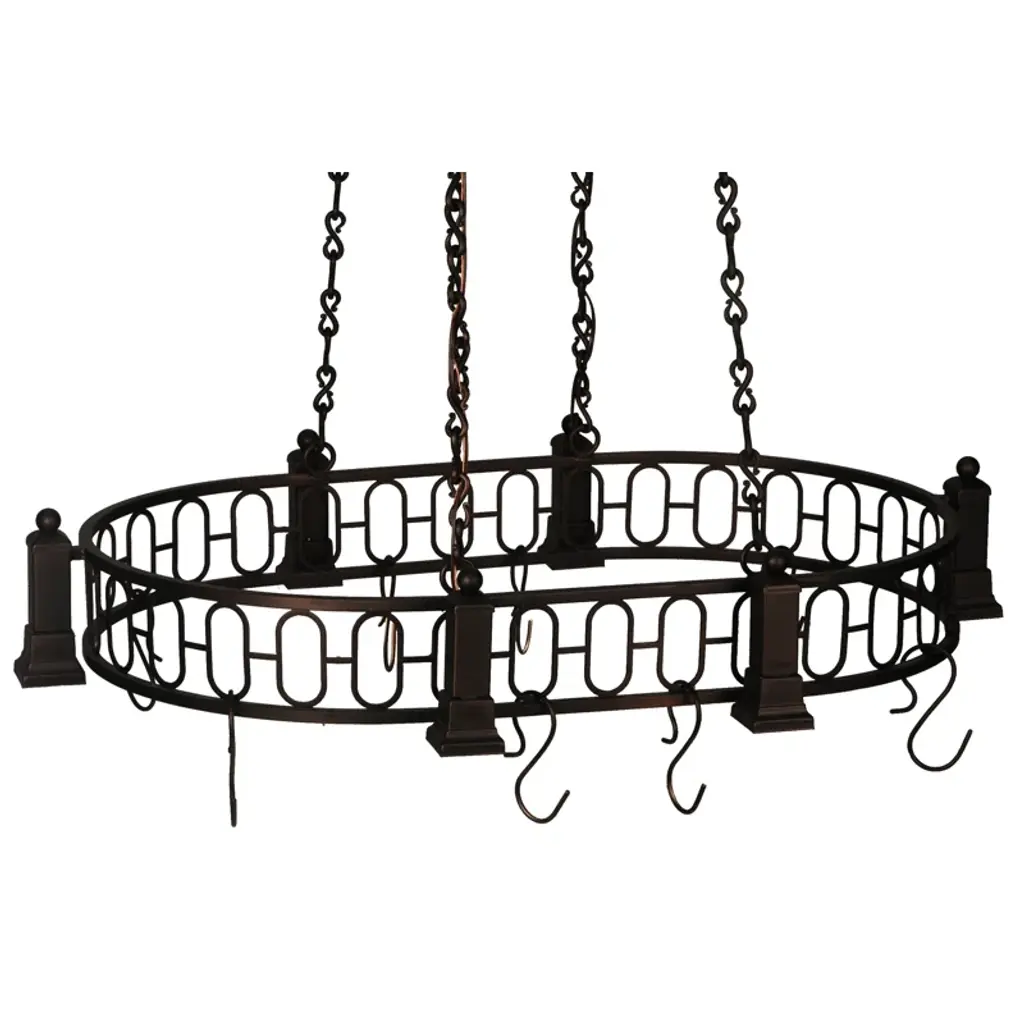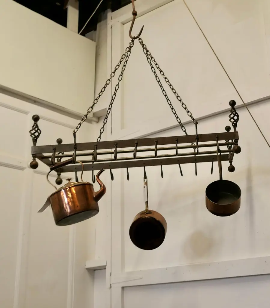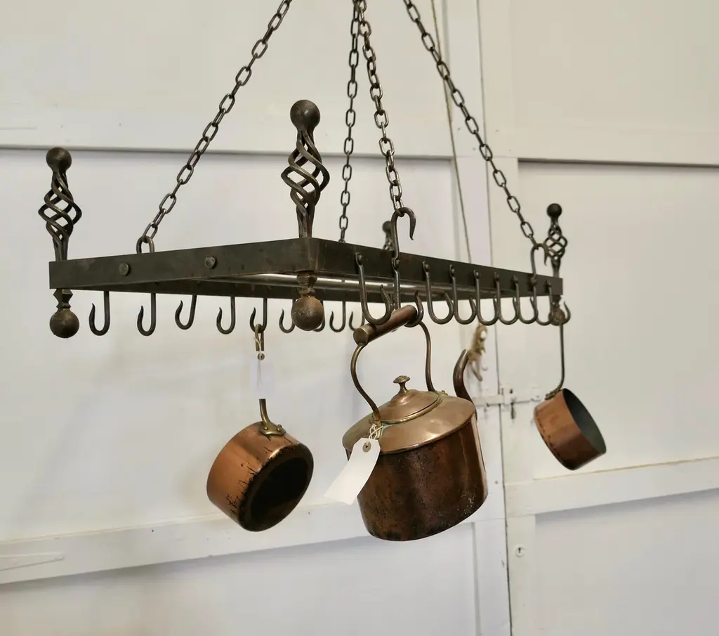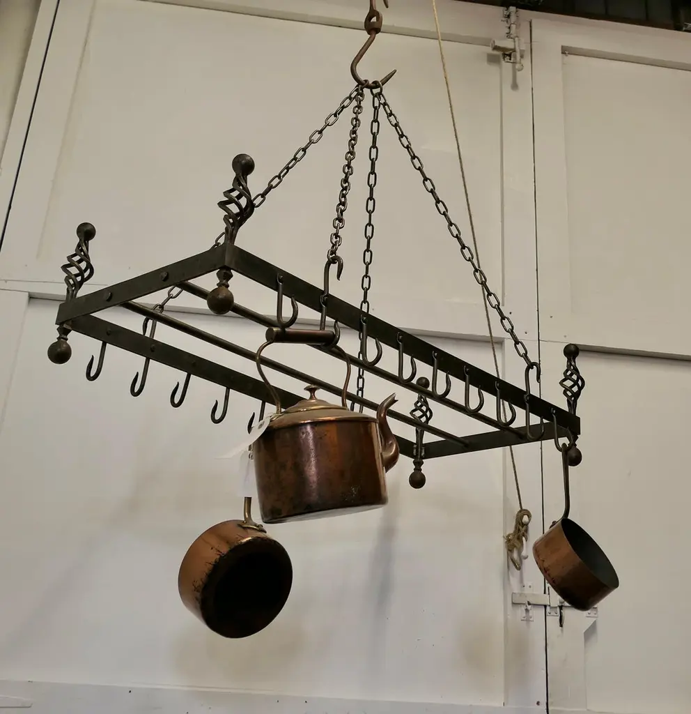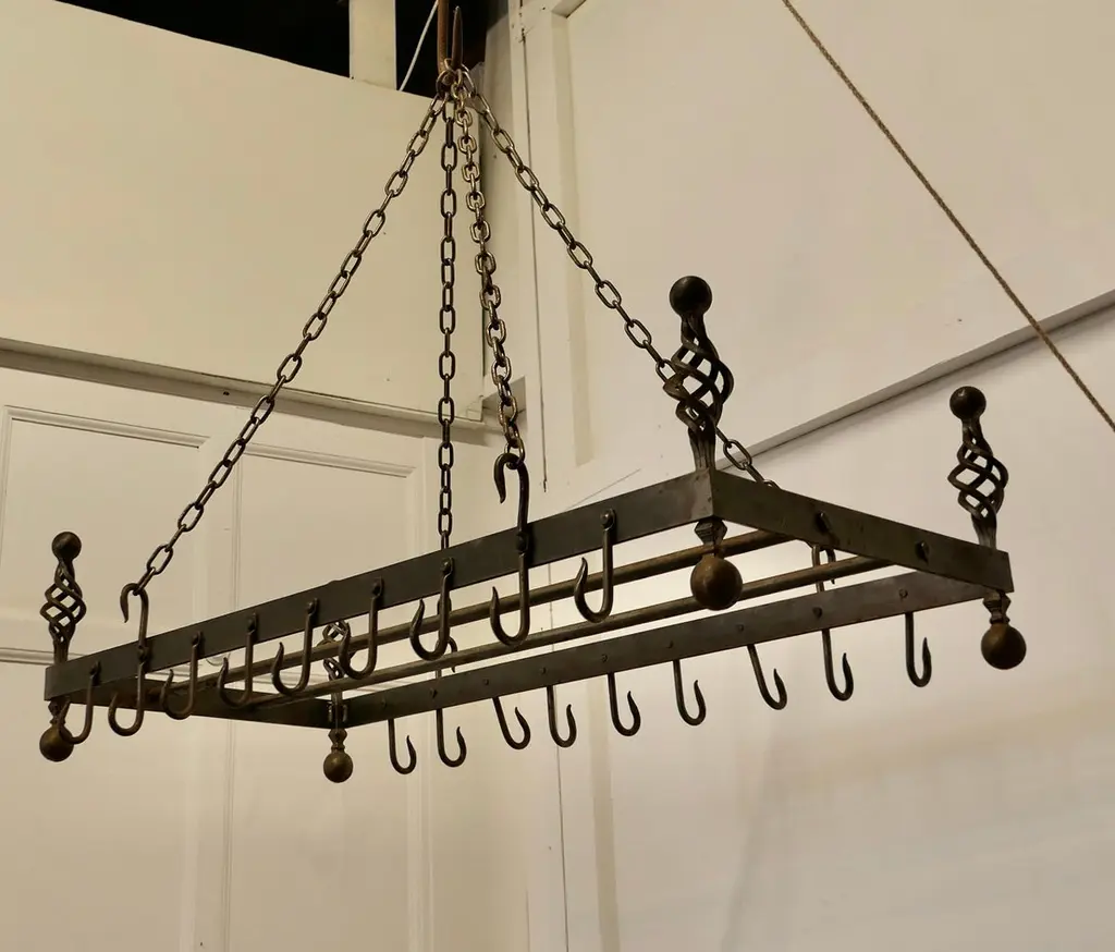 Blacksmith made iron game hanger, kitchen utensil or pot hanger.A great piece with lots of Character, it is a large rectangular piece it is set with 18 iron hooks, if you don’t need it to hang your game on how about your pots or kitchen utensils.The hanger is 22” x 42” 11” high or 31” including the chains.TJK179.