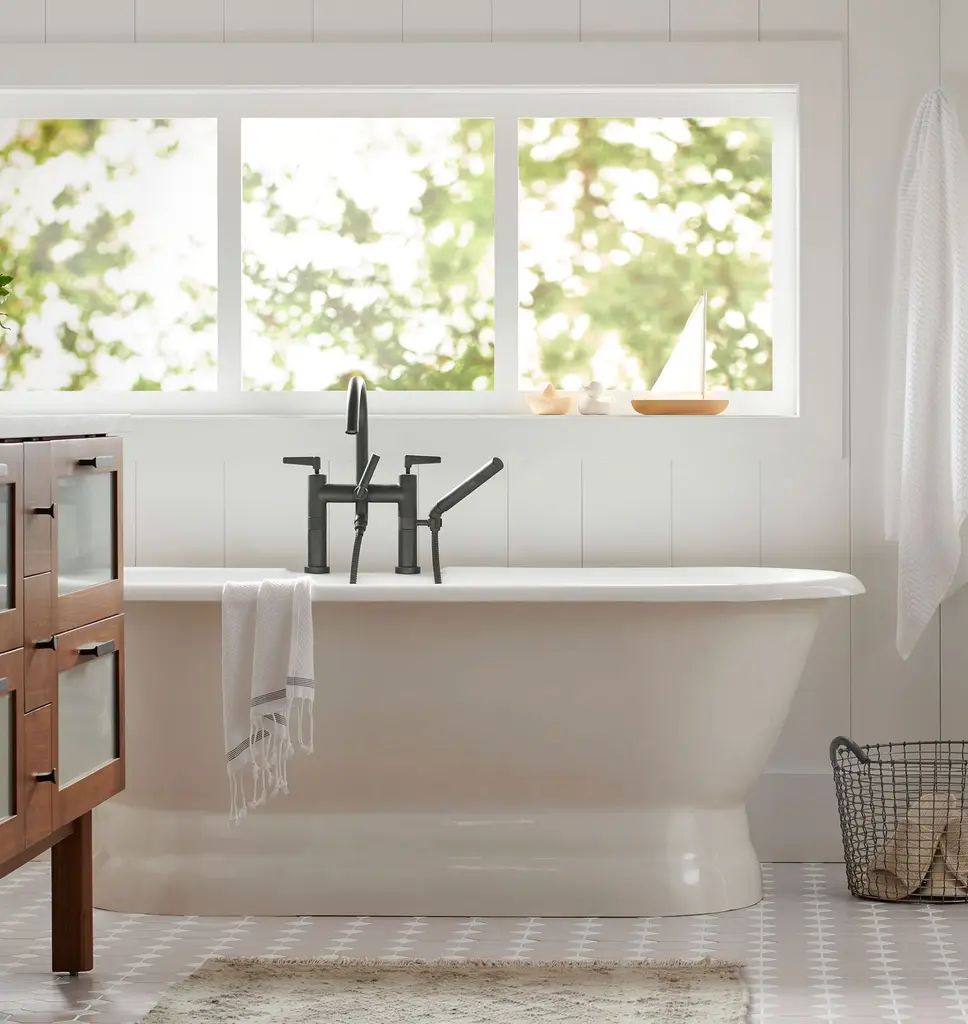Made with solid brass, Blair features industrial-inspired lever handles with streamlined curves. This deck-mounted design will bring a crisp, clean look to your bath.
