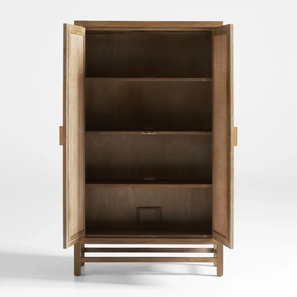 An unexpected mix of materials and textures adds a primitive/modern touch of the tropics to our Blake media storage console. Antiqued brass pulls accent the light brown finish of the plantation-grown teak, certified by the Forest Stewardship Council (FSC ®), a nonprofit organization that encourages responsible management of the world's forests. Double doors open to one fixed and two adjustable shelves that can accommodate dinnerware, office supplies or electronics (remote controls operate easily through the rattan panels). Cord cutouts and a sliding panel provide wire management.