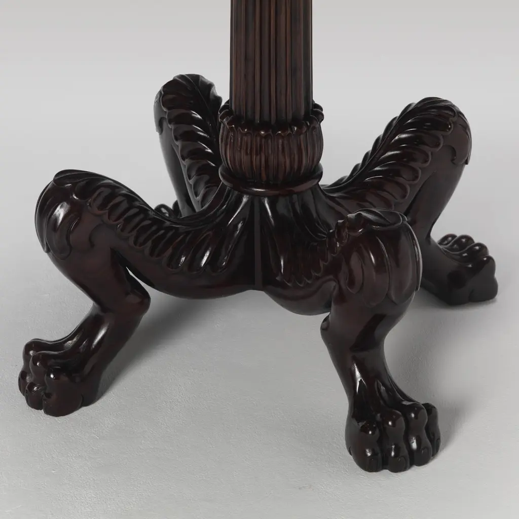 A fine regency grand tour Roman inspired carved wood tripod table. Specialist hand polished to resemble rosewood.Bespoke sizing, design adaptations and finishing available.We are currently working to a 30-36 week lead time.