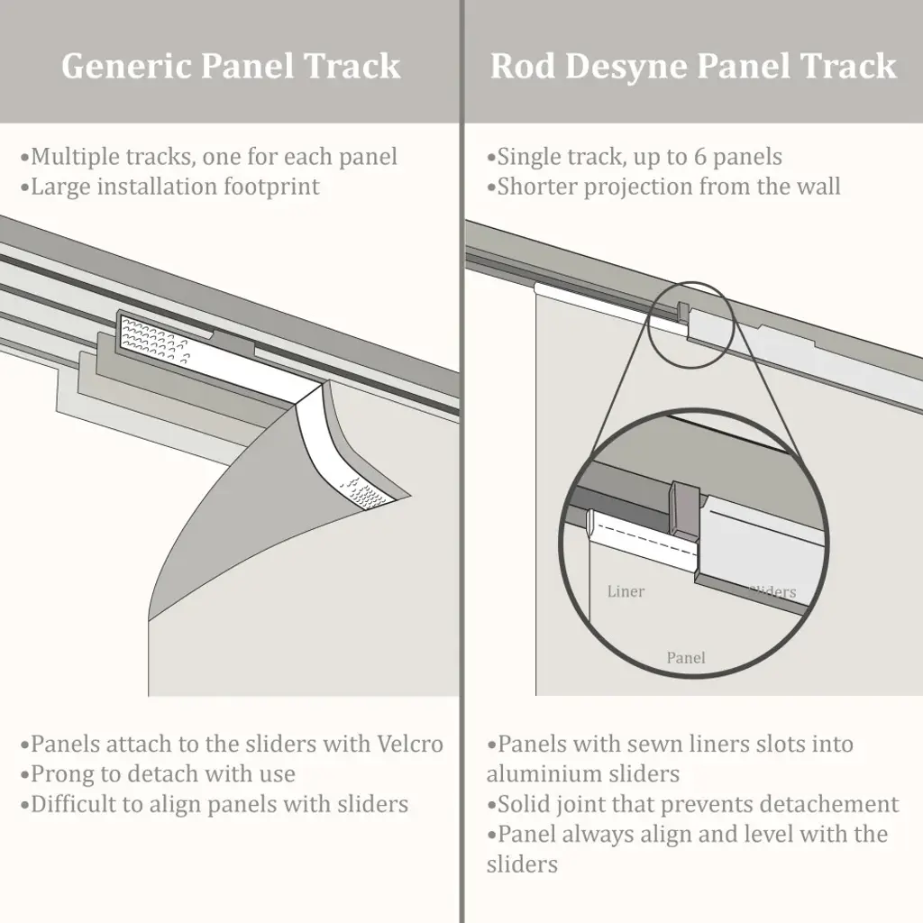 Central Design is pleased to announce the newly designed Panel Track, easily used as 2-way Vertical Blinds or Room Divider. Distinguished winner of the "2020 Good Design Award and 2021 MUSE Design Awards". Total Width is adjustable from 48-88". Individual Panel Size: 91.5" Height x 23.5" Wide. Overall Height including rail track is 94". The height of the Panel is adjustable by simply trimming the Panel and re-attaching the Liner and Panel Weight (Instructions provided). Wall or Ceiling mountable for versatility in its set up. Clearance (wall to the the back of Panel Track): extendable from 1.25"-3.25". Projection (wall to the furthest point): extendable from 3"-4.25". Single Rail Patented design; 1.25" thick for a very slick, thin, and compact design. No more bulky rail set ups. Made of steel for a durable and smooth operation of the Panels. Different from your standard panel track in that the sliders are designed in a more compact, overlapping fashion to reduce light bleed coming from in between the Panels. Track Material: steel. Panel Material: Polyester.More Panel Track sizes available & sold separately; 3-panel, 4-panel, 5-panel, 6-panel