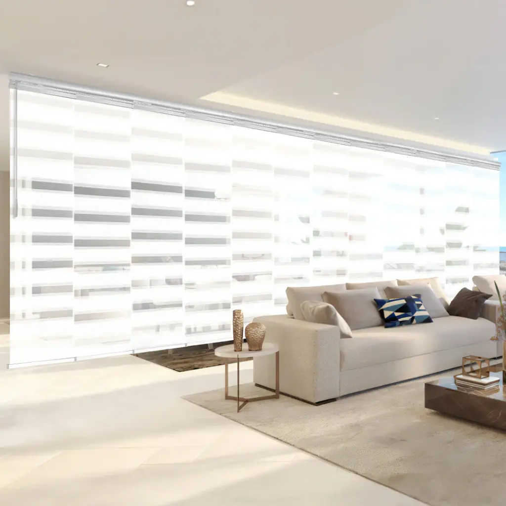 Central Design Products is pleased to introduce a new innovative panel track that offers easy 2-way installation, adding an alluring style and refined touch to your home decor. The double rail design of the track is sleek, compact, and reduces the overall footprint and weight of the installation, eliminating bulky, intrusive window treatments. Adjusting the panel height is a breeze � simply trim the panel, re-attach the liner, and install the panel weight. Detailed instructions are included.The panel track also features a patented slider design, made with aluminum and fitted with bearings that allow for durable and smooth operation. The sliders are stacked closer together than conventional panel tracks, reducing light bleed coming from the gaps between panels. This track has endless uses from dividing rooms, garages, offices, and closets to decorating windows and patios. Available in smaller sizes including 3, 4, 5, 6, and 7 panels. Extends from 140-260� wide. Each panel measures 23.5" wide and 116" tall, with a total installation height of 118.5" (includes the 2.5" rail track). The track can be wall or ceiling mounted. The panels can stack on the left or the right. The clearance from the wall is extendable from 1.25� to 3.25� and projection from the wall is extendable from 3� to 4.25�. Blanched White panel is made from 100% Polyester, with a light filtering shade that blocks 40% of the light.