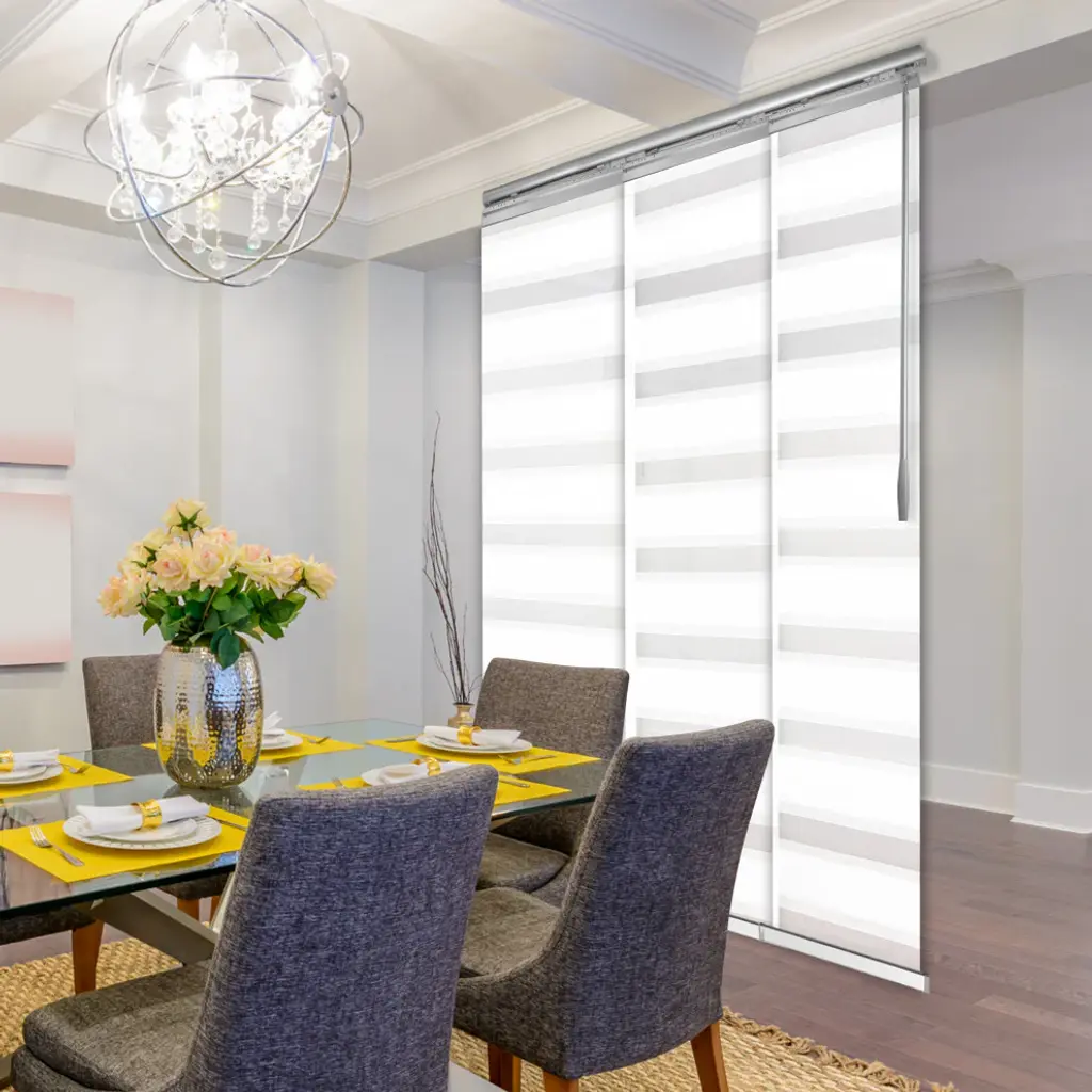 Central Design Products is pleased to introduce a new innovative panel track that offers easy 2-way installation, adding an alluring style and refined touch to your home decor. The single rail design of the track is sleek, compact, and reduces the overall footprint and weight of the installation, eliminating bulky, intrusive window treatments. Adjusting the panel height is a breeze � simply trim the panel, re-attach the liner, and install the panel weight. Detailed instructions are included.The panel track also features a patented slider design, made with aluminum and fitted with bearings that allow for durable and smooth operation. The sliders are stacked closer together than conventional panel tracks, reducing light bleed coming from the gaps between panels. This track has endless uses from dividing rooms, garages, offices, and closets to decorating windows and patios. Available in larger sizes including 8, 10, and 12 panels. Extends from 36-66� wide. Each panel measures 23.5" wide and 116" tall, with a total installation height of 118.5" (includes the 2.5" rail track). The track can be wall or ceiling mounted. The panels can stack on the left or the right. The clearance from the wall is extendable from 1.25� to 3.25� and projection from the wall is extendable from 3� to 4.25�. Blanched White panel is made from 100% Polyester, with a light filtering shade that blocks 40% of the light.