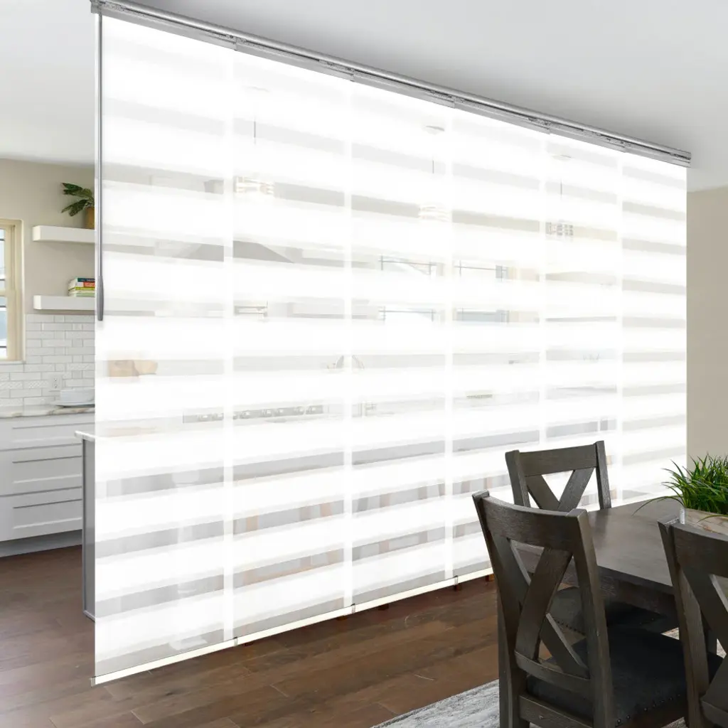 Central Design Products is pleased to introduce a new innovative panel track that offers easy 2-way installation, adding an alluring style and refined touch to your home decor. The single rail design of the track is sleek, compact, and reduces the overall footprint and weight of the installation, eliminating bulky, intrusive window treatments. Adjusting the panel height is a breeze � simply trim the panel, re-attach the liner, and install the panel weight. Detailed instructions are included.The panel track also features a patented slider design, made with aluminum and fitted with bearings that allow for durable and smooth operation. The sliders are stacked closer together than conventional panel tracks, reducing light bleed coming from the gaps between panels. This track has endless uses from dividing rooms, garages, offices, and closets to decorating windows and patios. Available in larger sizes including 8, 10, and 12 panels. Extends from 98-130� wide. Each panel measures 23.5" wide and 116" tall, with a total installation height of 118.5" (includes the 2.5" rail track). The track can be wall or ceiling mounted. The panels can stack on the left or the right. The clearance from the wall is extendable from 1.25� to 3.25� and projection from the wall is extendable from 3� to 4.25�. Blanched White panel is made from 100% Polyester, with a light filtering shade that blocks 40% of the light.