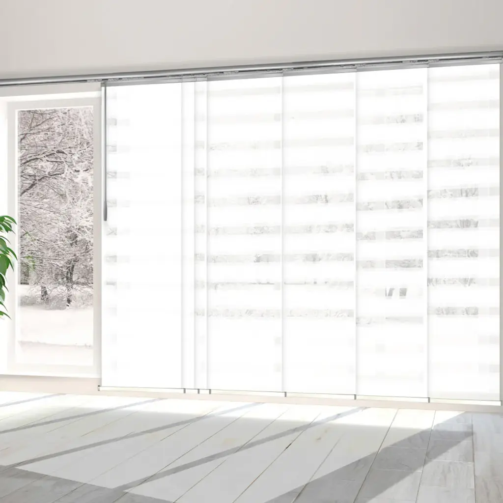 Central Design Products is pleased to introduce a new innovative panel track that offers easy 2-way installation, adding an alluring style and refined touch to your home decor. The single rail design of the track is sleek, compact, and reduces the overall footprint and weight of the installation, eliminating bulky, intrusive window treatments. Adjusting the panel height is a breeze � simply trim the panel, re-attach the liner, and install the panel weight. Detailed instructions are included.The panel track also features a patented slider design, made with aluminum and fitted with bearings that allow for durable and smooth operation. The sliders are stacked closer together than conventional panel tracks, reducing light bleed coming from the gaps between panels. This track has endless uses from dividing rooms, garages, offices, and closets to decorating windows and patios. Available in larger sizes including 8, 10, and 12 panels. Extends from 110-153� wide. Each panel measures 23.5" wide and 91.5" tall, with a total installation height of 94" (includes the 2.5" rail track). The track can be wall or ceiling mounted. The panels can stack on the left or the right. The clearance from the wall is extendable from 1.25� to 3.25� and projection from the wall is extendable from 3� to 4.25�. Blanched White panel is made from 100% Polyester, with a light filtering shade that blocks 40% of the light.