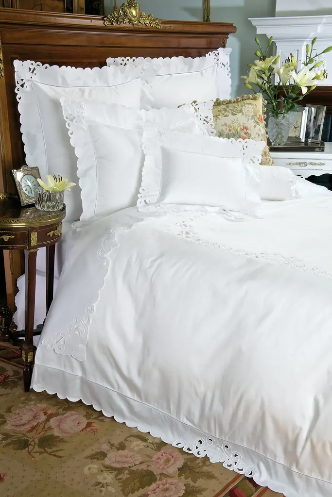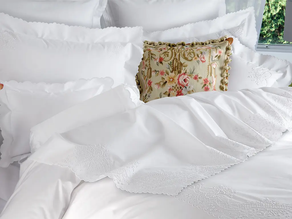 Like the breathtaking beauty of a wedding gown, finest 600 thread count Italian cotton percale in pristine White is delicately hand embroidered with pure White flower bouquets. Crafted as carefully and caringly as a seamstress would do, this lovely import is finished with embroidered edges of lilting scallops and tiny dots.