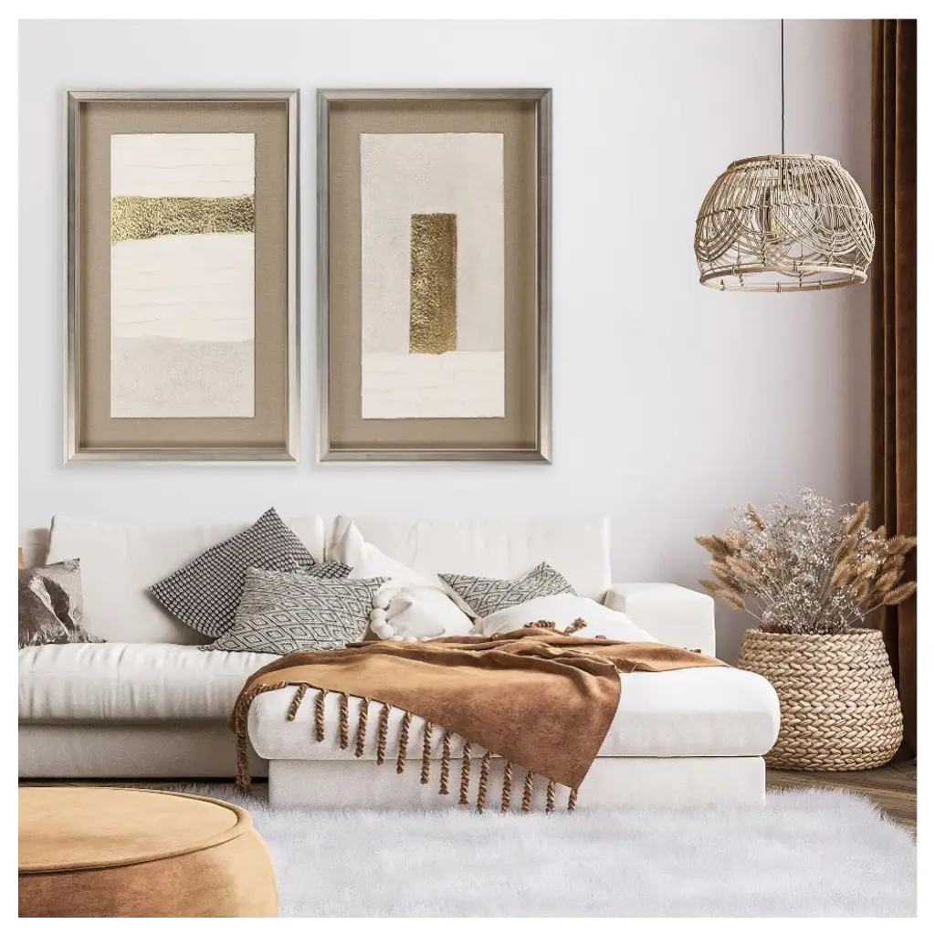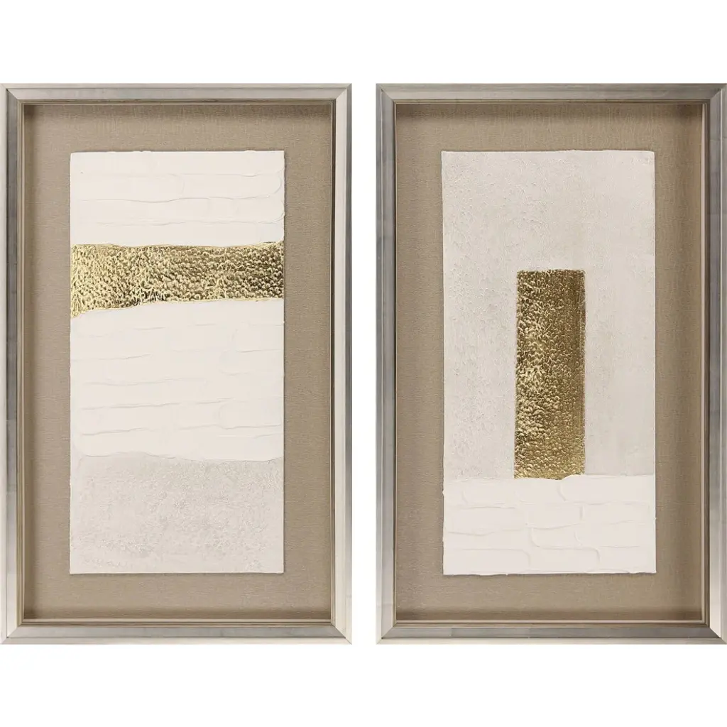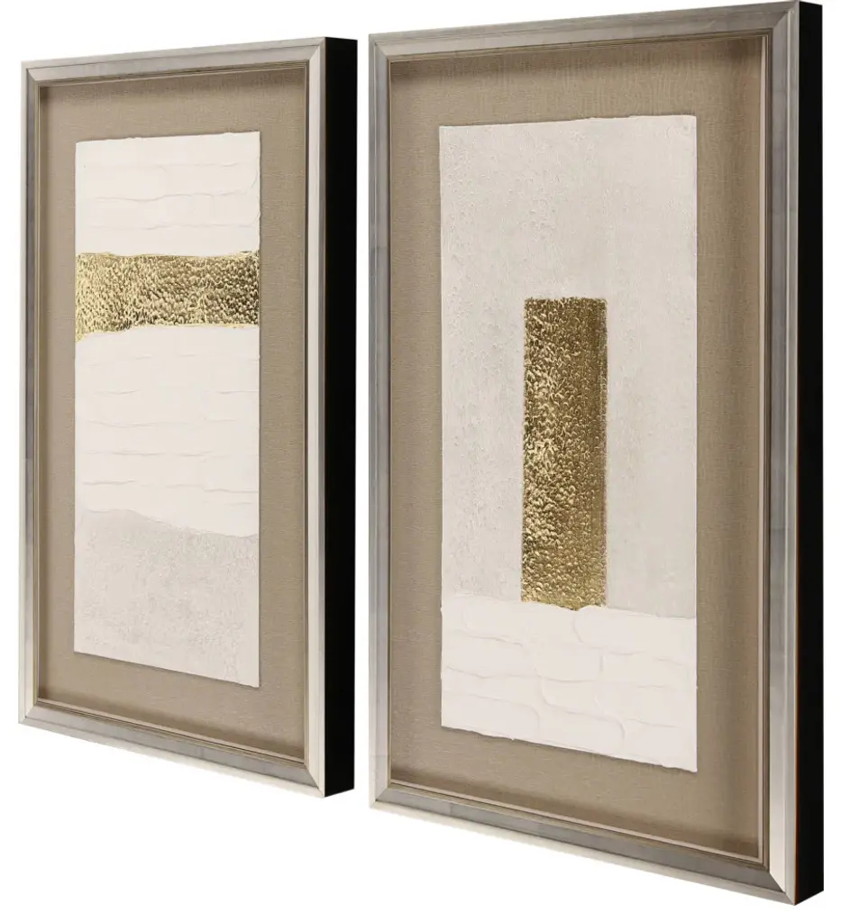 Exclusive mixed media with gold leaf. Framed in a silver leaf wood shadow box style with gold wash edging and black side.