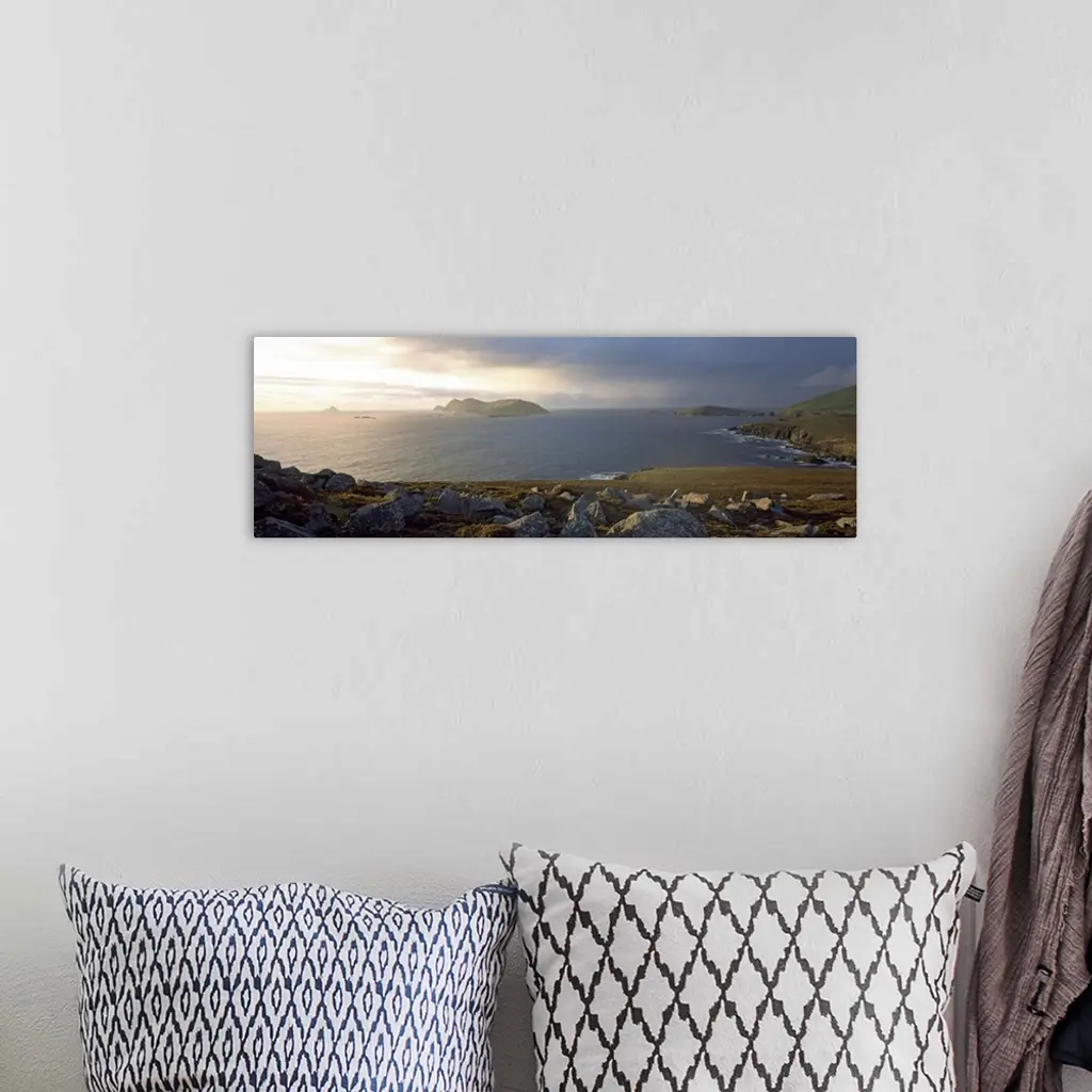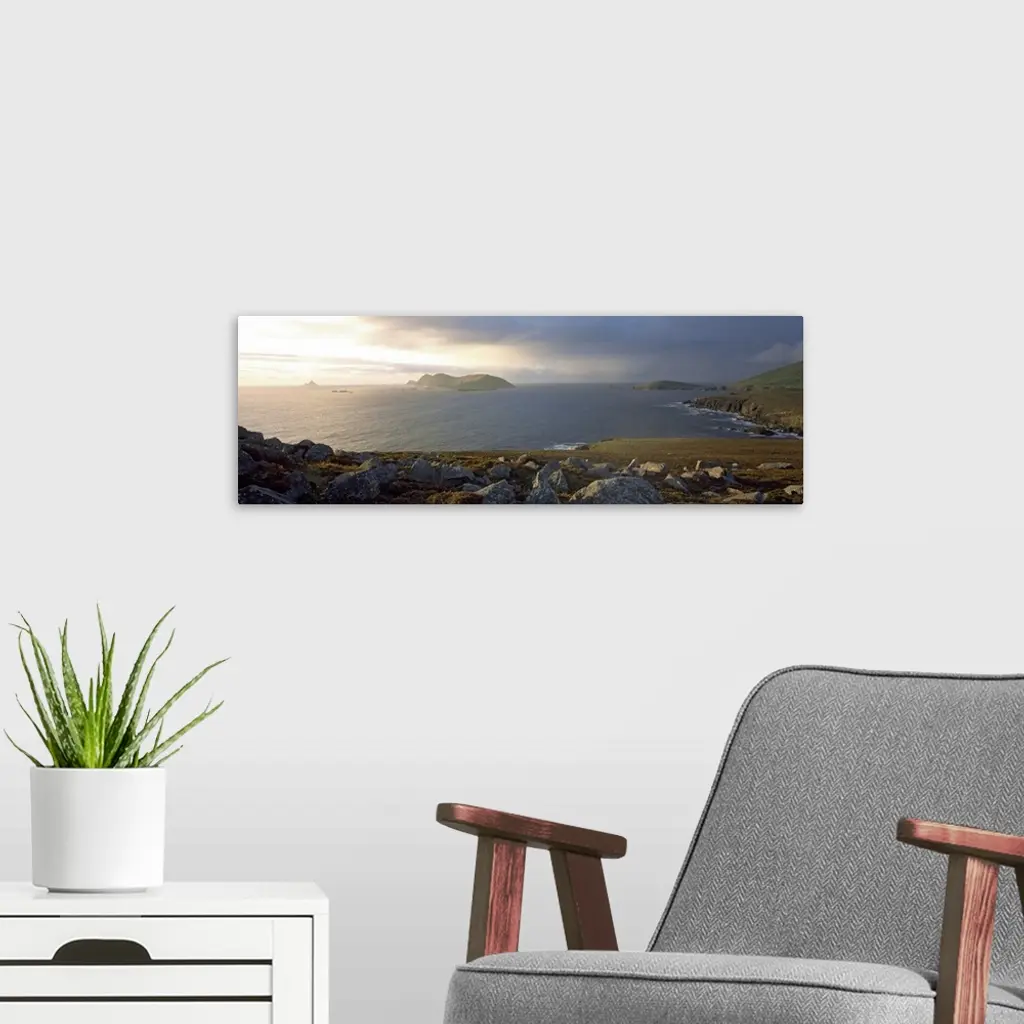 This is a panoramic photograph of the view over a rocky sea cliff and the Atlantic Ocean beyond.