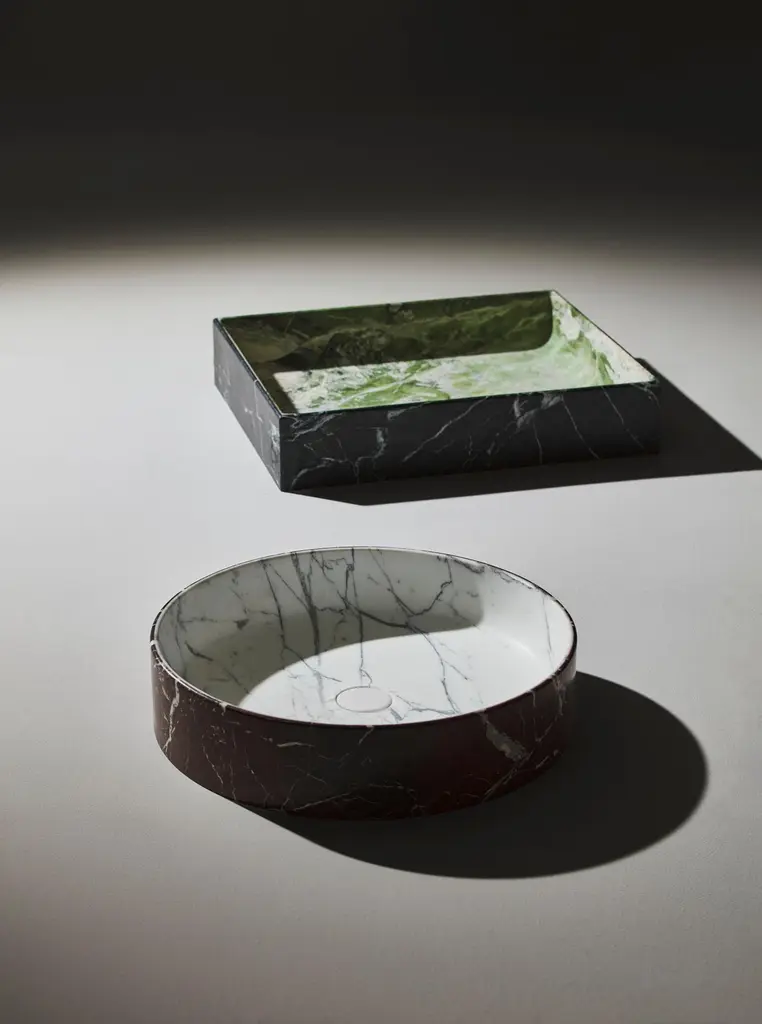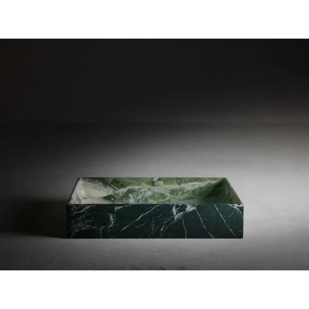 Blessed Square Countertop Basin by Kreoo Designed by Christophe PilletDimensions: D 50 x W 60 x H 12.Materials: Verde Alpi and Artik Green marbles.Weight: 31,5 kg.Available in different marble and travertine options. Prices include a drain with a marble cover. For custom drain requests: technical details and price surcharge to be defined. Please contact us.Marble artistry comes to form in the collection of premium sinks, Blessed, designed by Christophe Pillet. Polychrome declinations unite in a combination of contrasting marbles in a unique research of color. Inventive design is realized through geometric lines, where the internal and external surfaces create an elegant and customizable contrast. Bespoke in nature, select your desired materials from our Kreoo catalog with a variety of veins and shades. Available in both circular and rectangular shapes, the expert craftsmanship is evident in the details. The two contrasting materials meet on the upper border, which has been skillfully worked by hand to reach the thinnest possible thickness, an extraordinary detail when associated with natural materials. Standing at only 12 cm high (4.7’’), Blessed pushes the boundaries of refinement with an external finish that utilizes marble not typically used for this kind of product. The result is a contemporary collection with harmonious proportions, where each item is unique.Kreoo: the new marble experienceKreoo links its name to the best Italian tradition in marble manufacturing and brings to new light the primordial charm of a material that has witnessed the evolution of civilizations and cultures.From the bathroom and living room to coverings, home accessories, and lamps, the company works with natural stone in various forms and aesthetic compositions, enriching it with other materials such as metals, wood, and glass. The result is a fascinating and chromatic language, suitable both indoors and outdoors. Expressed in contemporary but still customizable designs, Kreoo highlights workmanship know-how and excellence.The brand, born in 2010 by the experience of Decormarmi and its worldwide distribution strength, has led to major international projects, especially in hospitality and luxury residential.
