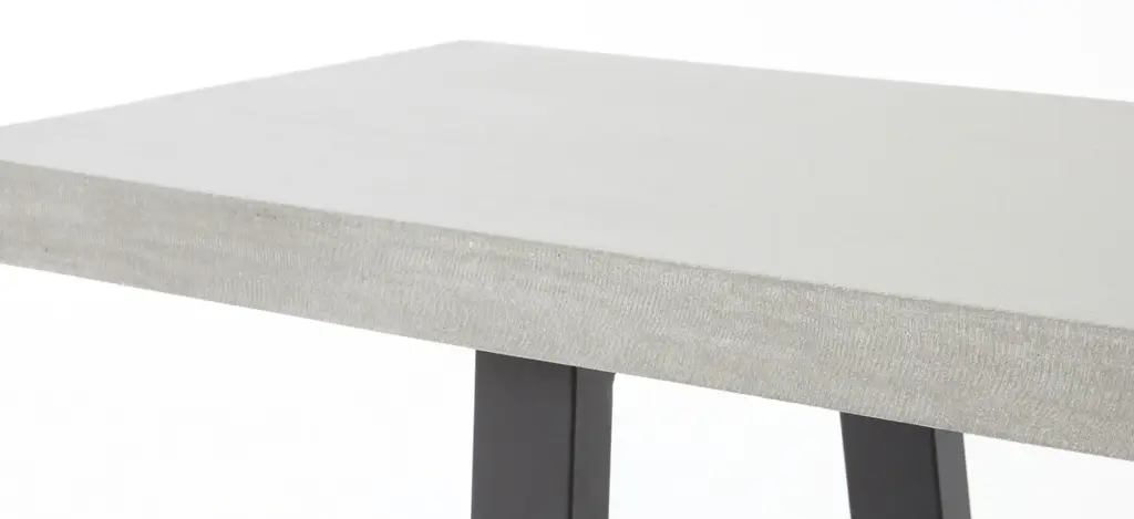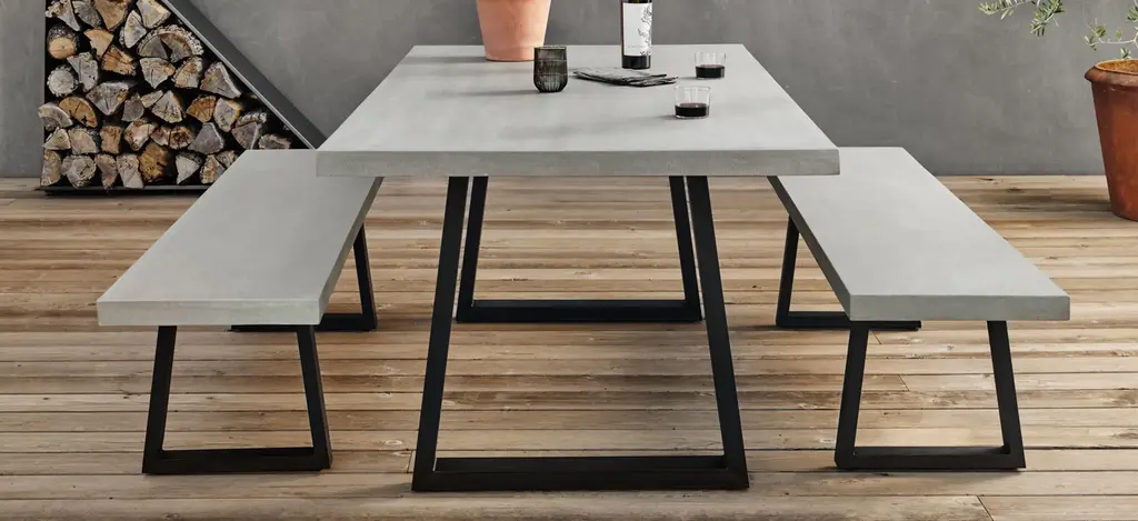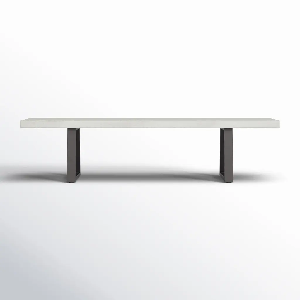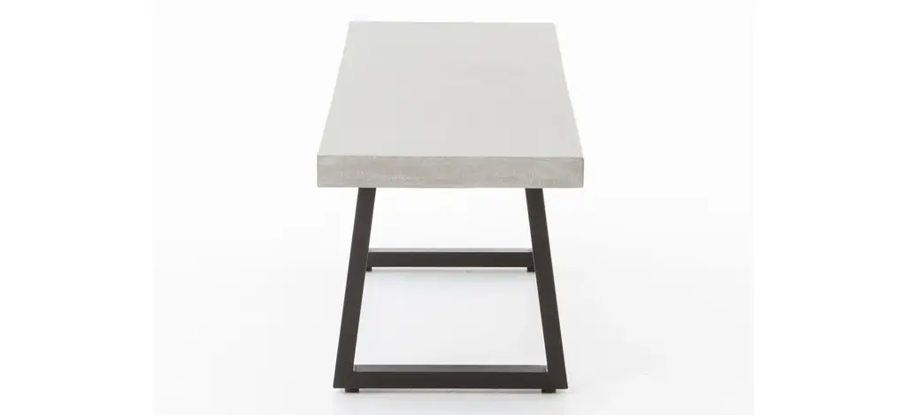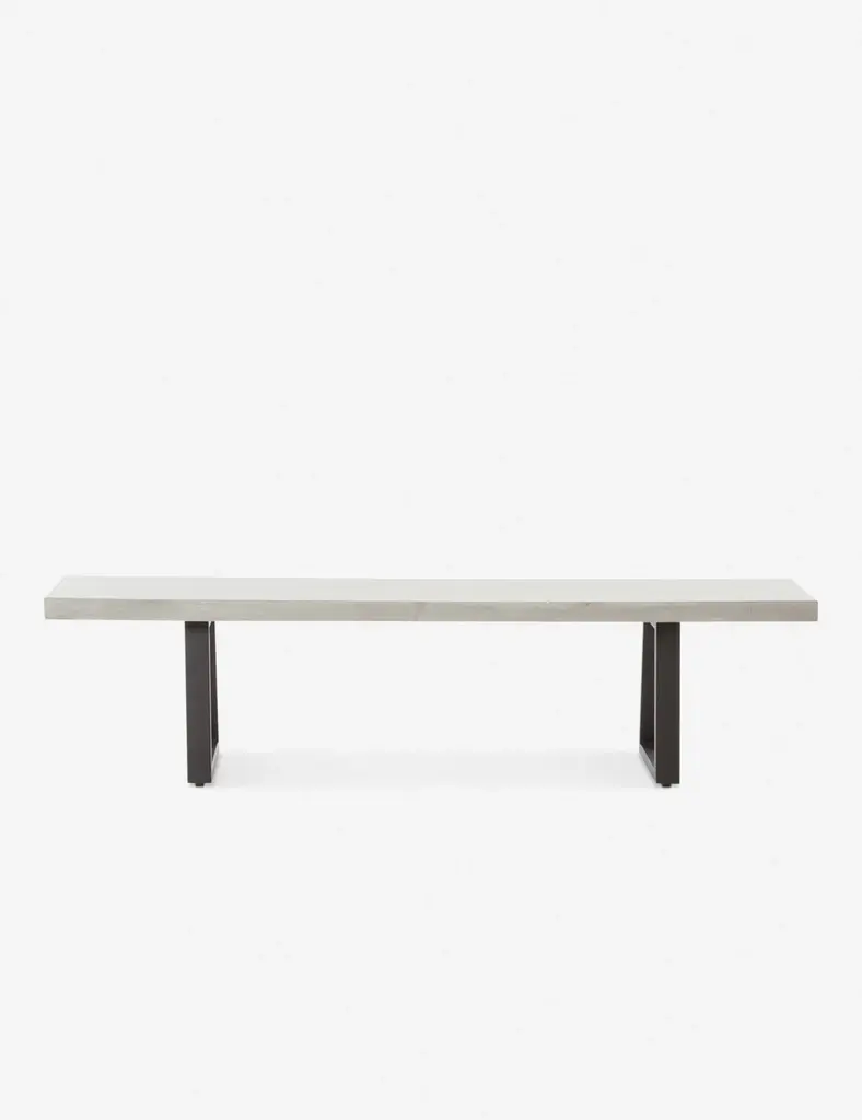 This strikingly simple Blithe outdoor dining bench derived from river sand and polished to a smooth sheen. Angled, matte black iron legs add architectural appeal to bench-style seating. Slight color variance is to be expected, and speaks to lava stone's organic nature. Cover or store indoors during inclement weather and when not in use.