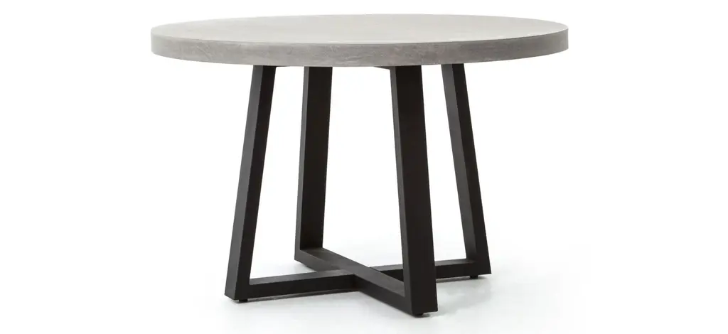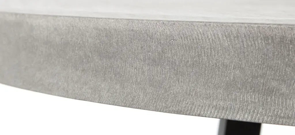 A strikingly simple poly-resin top derived from river sand is polished to a smooth sheen. An angled, matte black iron base adds architectural appeal with this Blithe round outdoor dining table. Slight color variance is to be expected, and speaks to lava stone's organic nature. Cover or store indoors during inclement weather and when not in use.