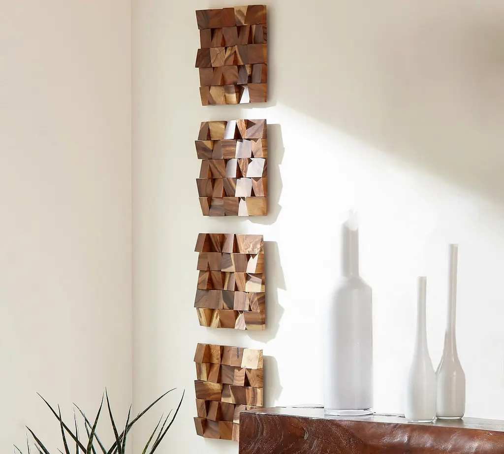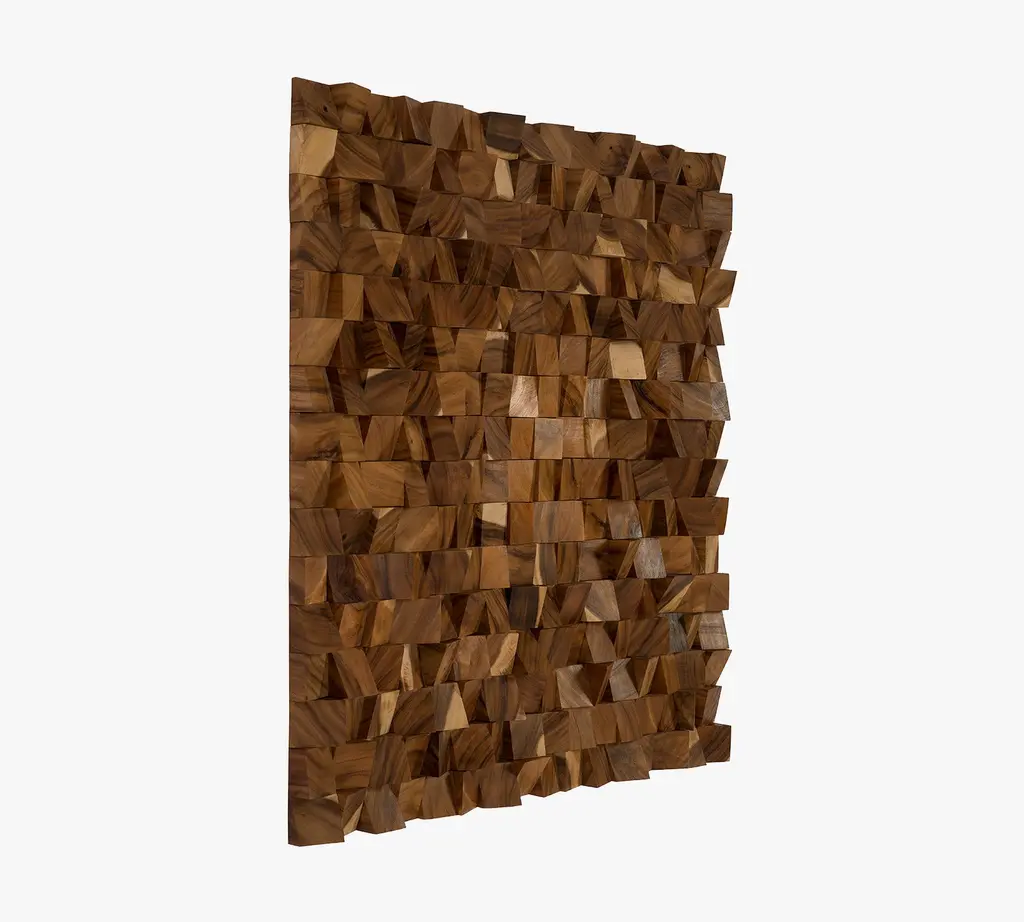 Bring Nature’s art indoors. Salvaging irregular end-cuts of chamcha wood from the workshop floor, artisans compose this modern, but organic, artwork. The varying heights, grains, angles, and cuts of each piece lend a sculptural look and the wood has a rich, organic patina that manmade materials only wish they could achieve.
