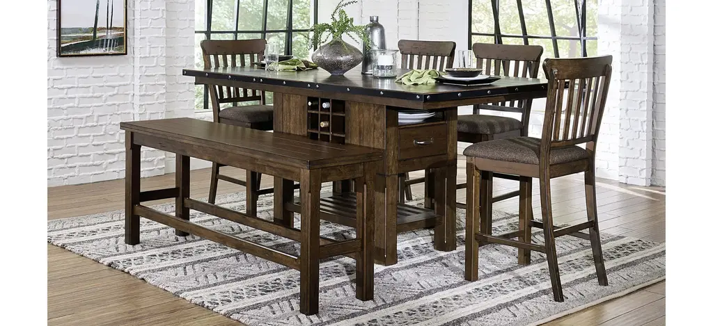 Transitionally styled with a burnished brown finish, the Blofeld counter height bench features bold accenting and sturdy legs.