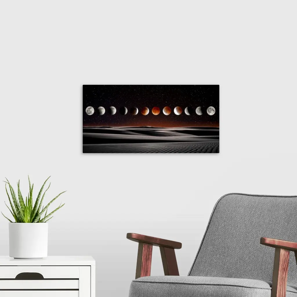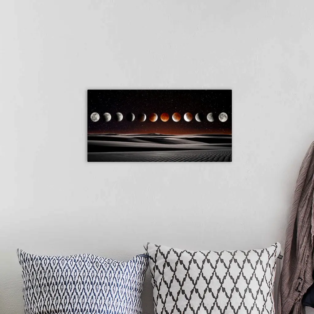 A horizontal composite photograph of the Blood Moon Eclipse.