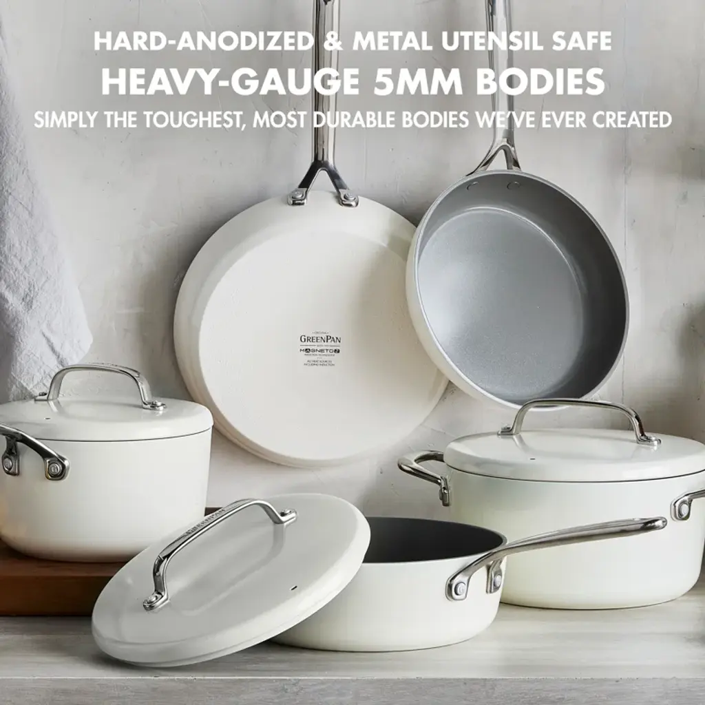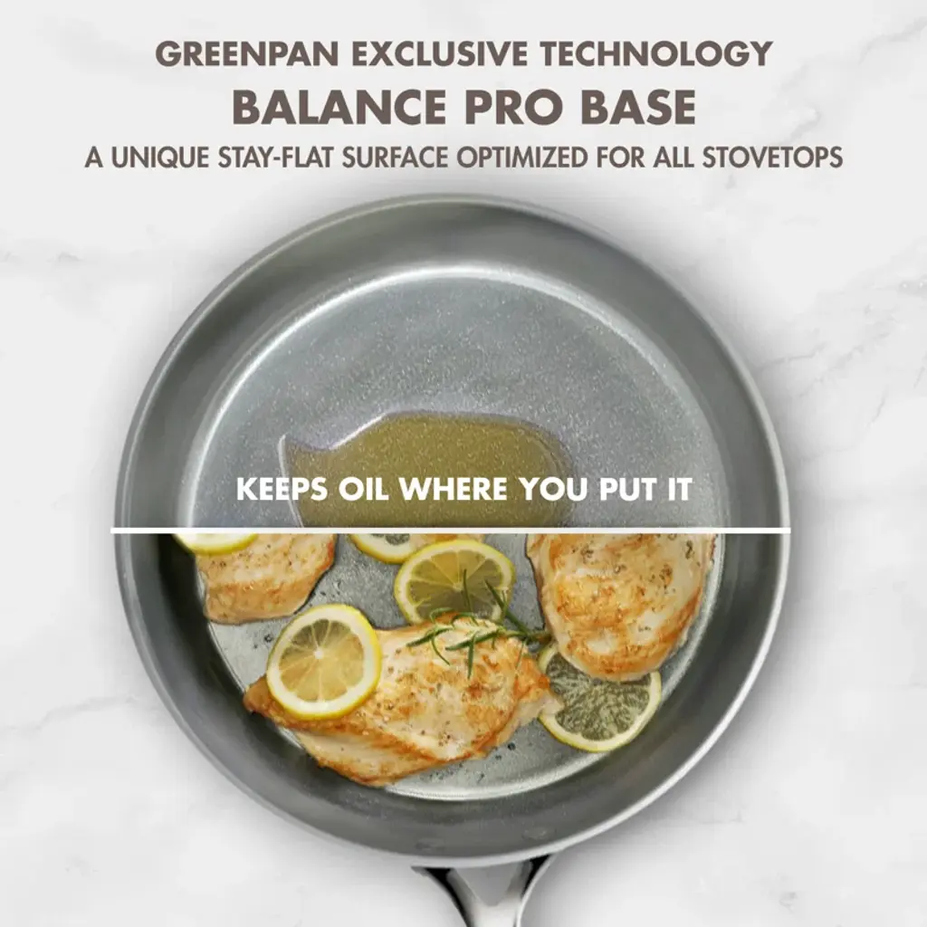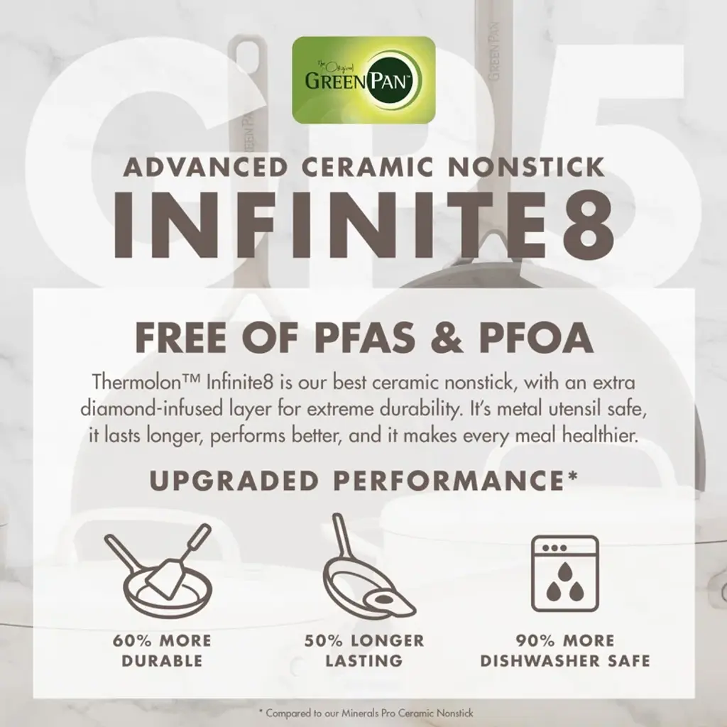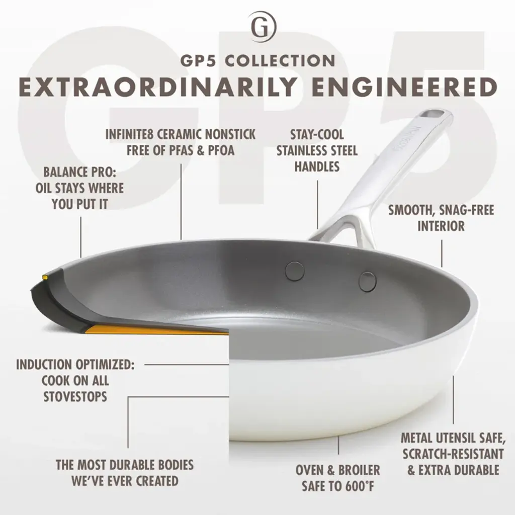 GP5 incorporates 15 years of cook-centric innovations in one cutting-edge collection. These extraordinarily engineered pots and pans are in a class all their own. You may not notice the integrated technologies at first glance, but you’ll appreciate them when you start cooking. This set is designed to deliver everything from braised chicken thighs to simple morning eggs with ease. No matter what you’re making, you can use less oil and get more contact with this pan’s innovative Balance Pro Base. All pans flex when they’re heated, but this collection’s ultra-tough 5mm thick frypans and sauté pan are designed to flex internally, meaning oil stays where you put it and your food gets maximum contact with the pan. We invented ceramic nonstick cookware 15 years ago, and we’ve perfected it with Infinite8. This groundbreaking ceramic nonstick coating is the most advanced ceramic nonstick ever made. It’s ultra-durable, scratch-resistant, and features layers of diamonds for extraordinary performance. No other coating comes close. As always, it’s PFAS-free to make every meal healthier. These pans feature Magneto Induction Technology for remarkable performance on all stovetops, including induction. The sturdy stainless steel handles are reverse riveted to create a smooth, snag-free interior. The Oven and broiler are safe to 600˚F. Dishwasher safe for easy cleanup.
