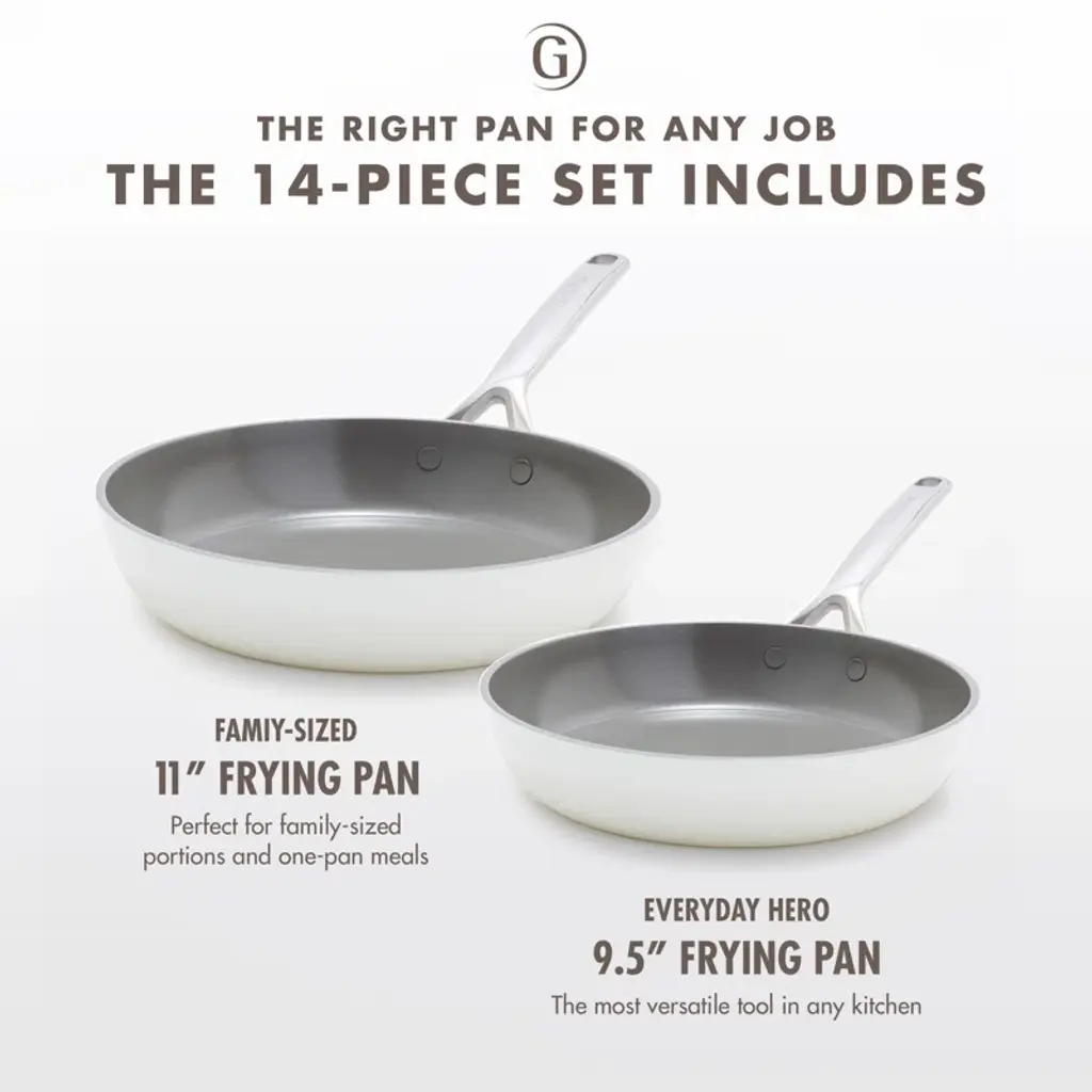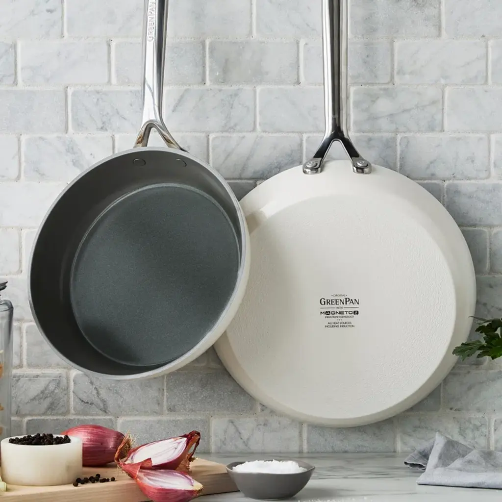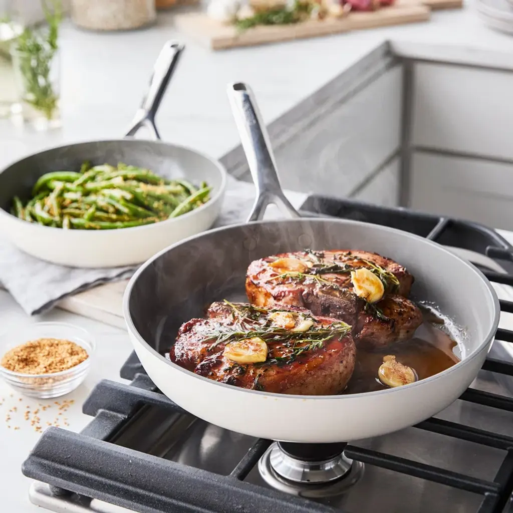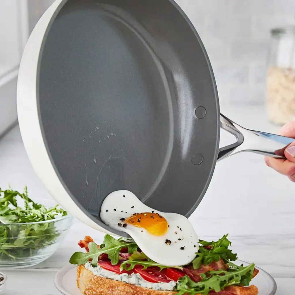 GP5 incorporates 15 years of cook-centric innovations in one cutting-edge collection. These extraordinarily engineered pots and pans are in a class all their own. You may not notice the integrated technologies at first glance, but you’ll appreciate them when you start cooking. This set is designed to deliver everything from braised chicken thighs to simple morning eggs with ease. No matter what you’re making, you can use less oil and get more contact with this pan’s innovative Balance Pro Base. All pans flex when they’re heated, but this collection’s ultra-tough 5mm thick frypans and sauté pan are designed to flex internally, meaning oil stays where you put it and your food gets maximum contact with the pan. We invented ceramic nonstick cookware 15 years ago, and we’ve perfected it with Infinite8. This groundbreaking ceramic nonstick coating is the most advanced ceramic nonstick ever made. It’s ultra-durable, scratch-resistant, and features layers of diamonds for extraordinary performance. No other coating comes close. As always, it’s PFAS-free to make every meal healthier. These pans feature Magneto Induction Technology for remarkable performance on all stovetops, including induction. The sturdy stainless steel handles are reverse riveted to create a smooth, snag-free interior. The Oven and broiler are safe to 600˚F. Dishwasher safe for easy cleanup.