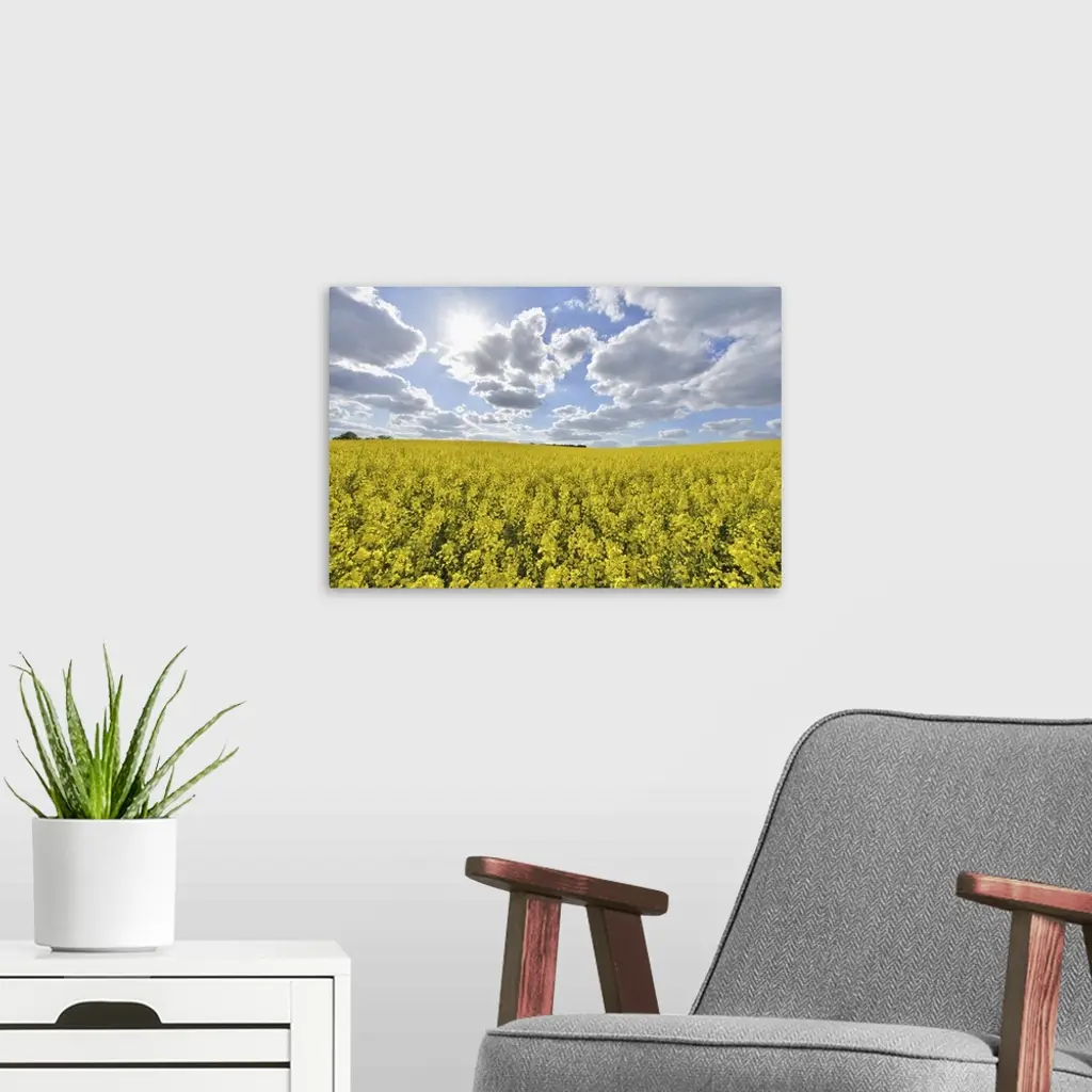 Blooming Canola Field with Sun in Spring, Schmachtenberg, Spessart, Franconia, Bavaria, Germany