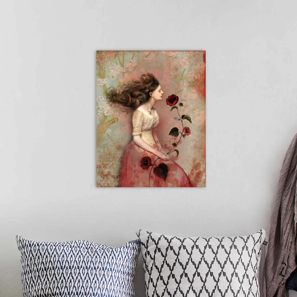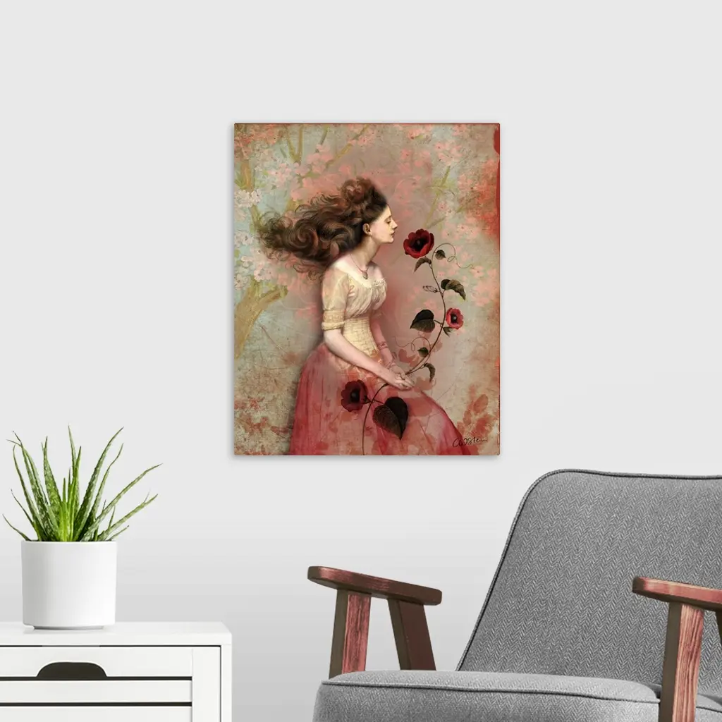 A contemporary portrait of a woman holding red flowers.
