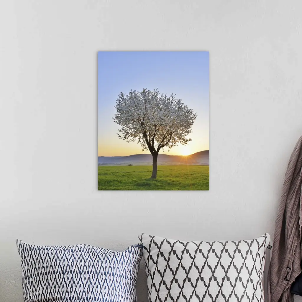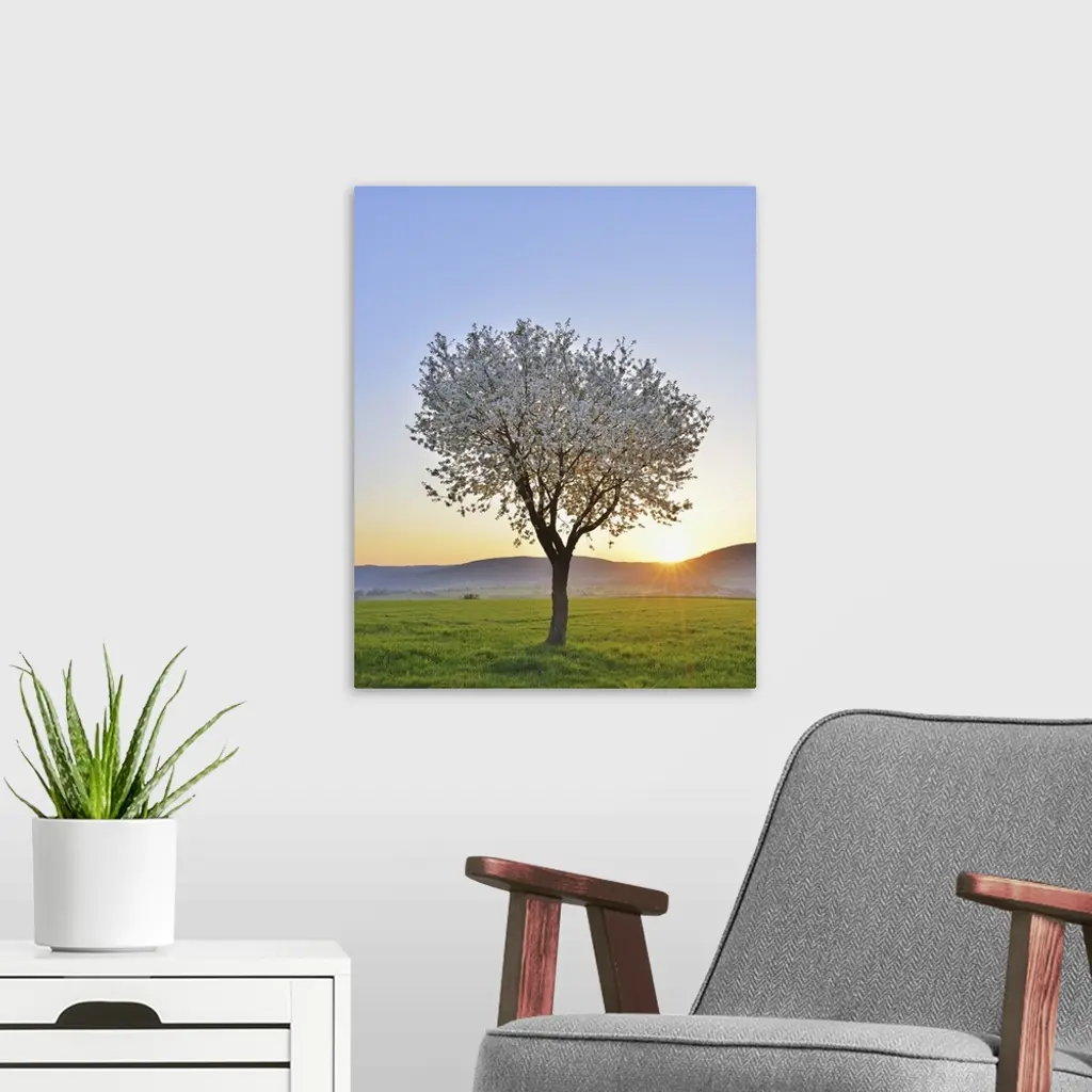 Blossoming Cherry Tree In Spring At Sunrise, Franconia, Bavaria, Germany