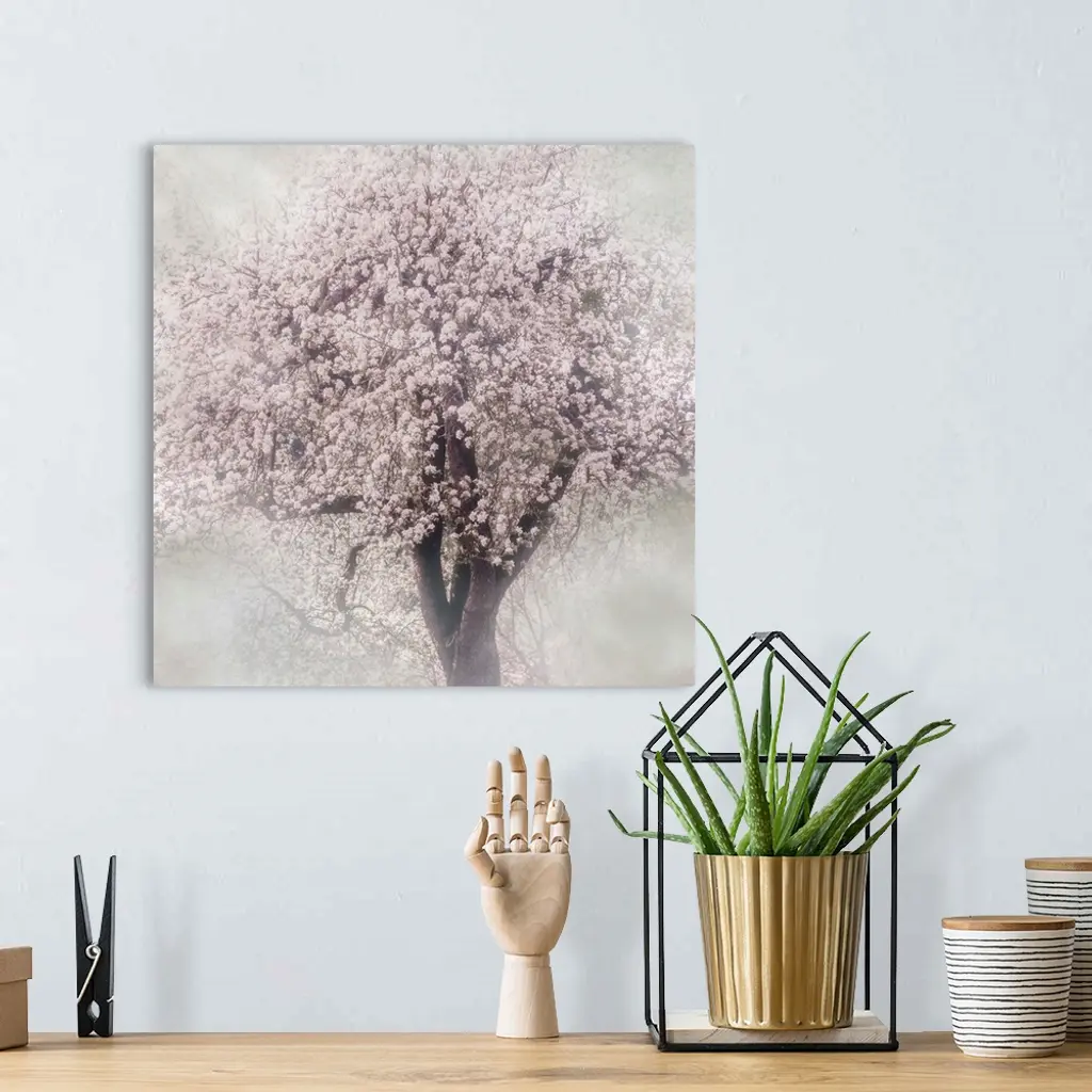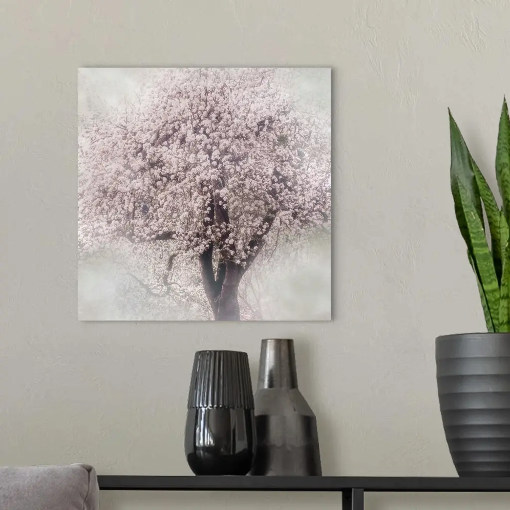Photograph of a blooming cherry tree with a soft focus vignette on the edges.