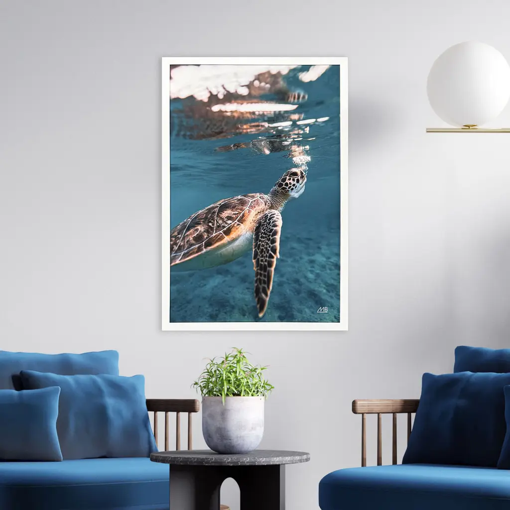 A sea turtle glides through a picturesque ocean of blue. Framed to the image in a lacquered white wood shadow box style molding.