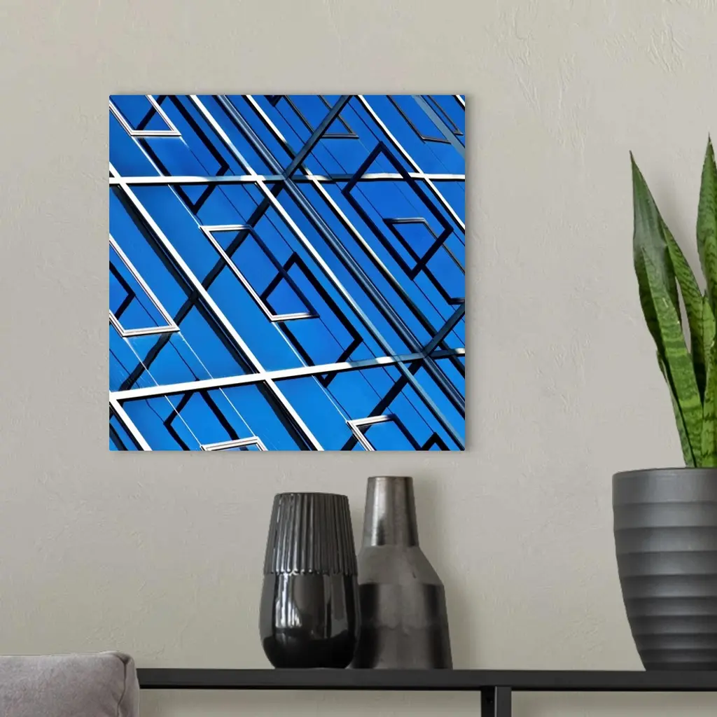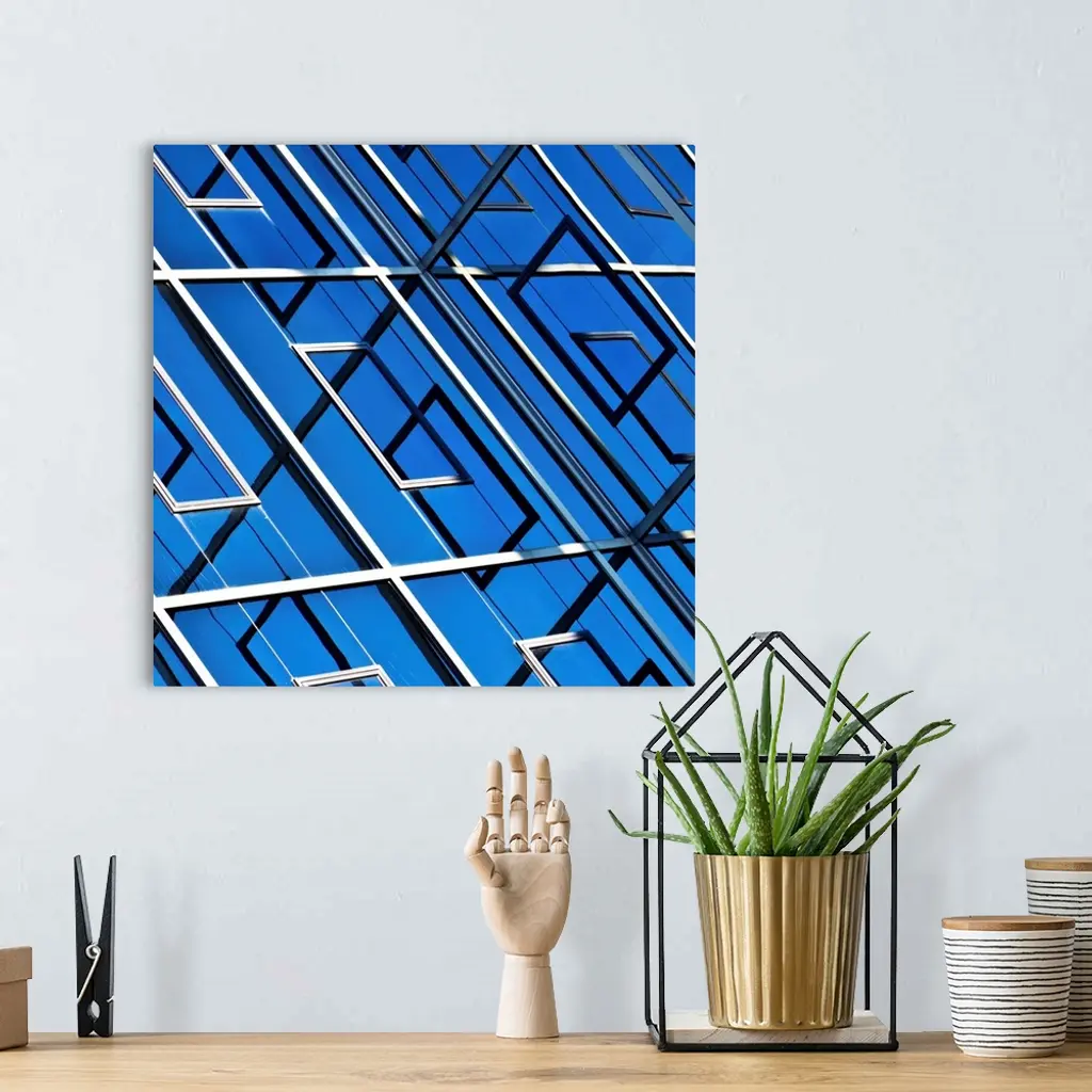Blue, abstract and geometric reflection on facade of modern building. wall art for home and office decor. Discover canvas art prints, photos, mural, big canvas art and framed wall art in GreatBigCanvas.com's varied collections.