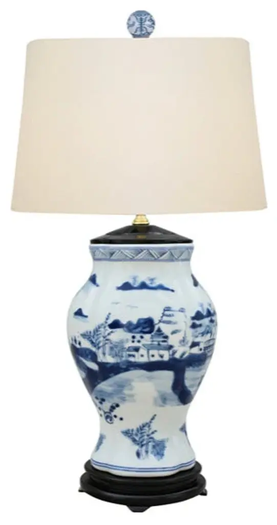 Blue & White Porcelain Canton Drum Lamp with Crystal BaseAdjust: 17" HIGH 9" WIDELamp Body Height: 8.3"Lamp Base DPTH and Width: 5.7" x 5.7"IN LINE Switch Maximum 40W, UL LISTEDShade: Retro Drum Hand Rolled Edge Hard Back 9" OFF WhiteItem Number: LPBWS6Z6JSLead Time: 3-4 weeks