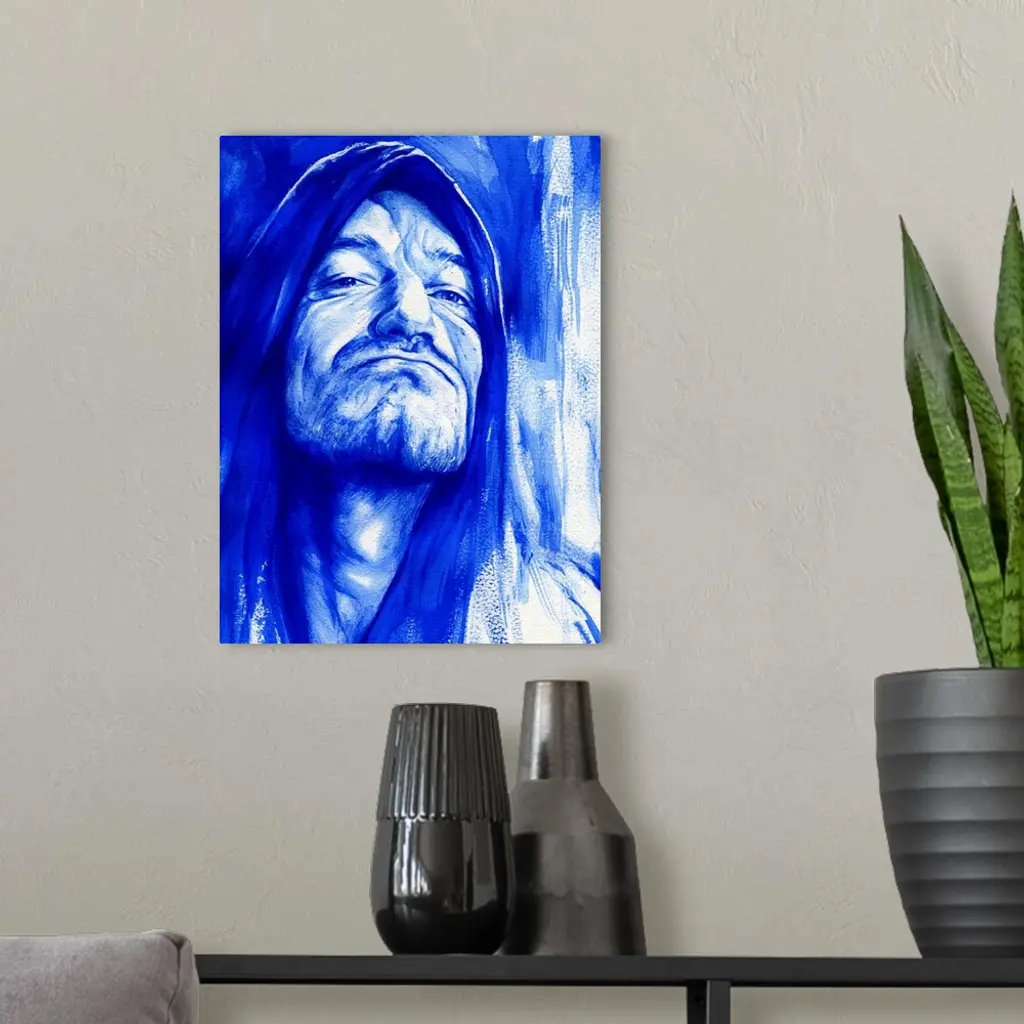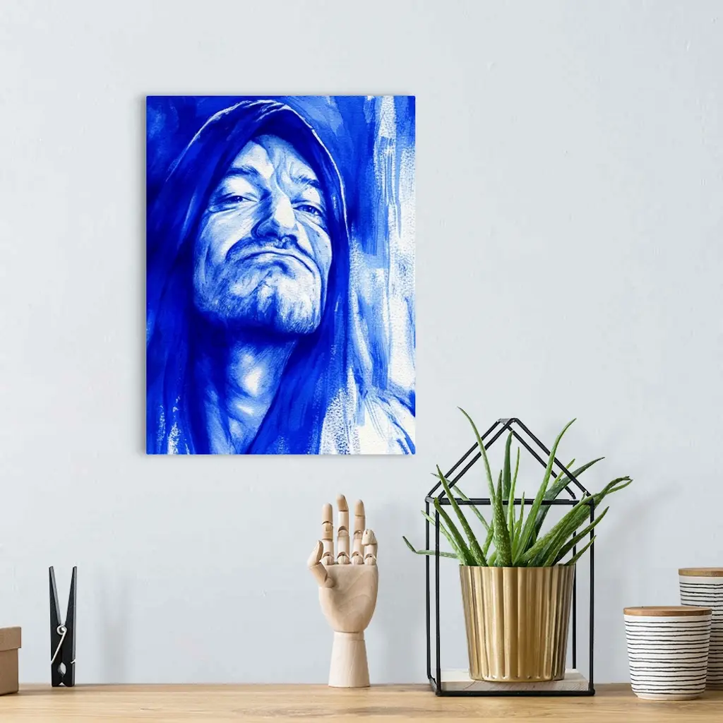 Watercolor portrait of Bono in shades of Ultramarine blue.