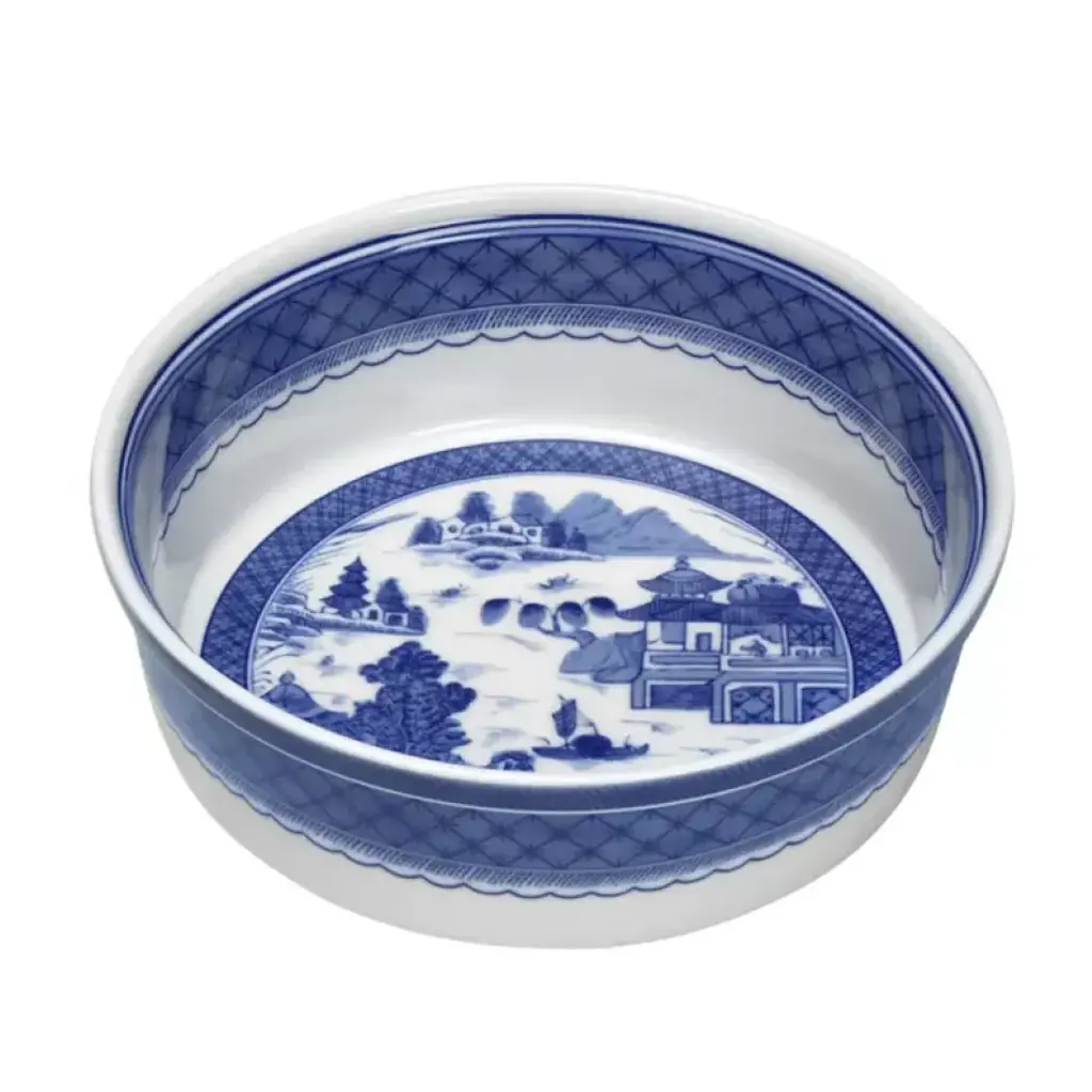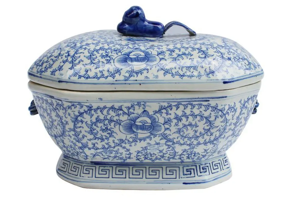 The Octagonal tureen and stand is one one the most popular and iconic piece in the Blue Canton pattern. It is substantial and can be used for serving or as decoration. Licensed product of Historic Charleston. A favorite with brides, Mottahedeh specializes in luxurious patterns and unique, elegant shapes that are reproduced from china found in museums and historical societies. The patterns feature complex and vibrant colors, and hand-painted gold decoration. The pieces are surprisingly fresh and timely, and look wonderful in both contemporary and traditional dining rooms.