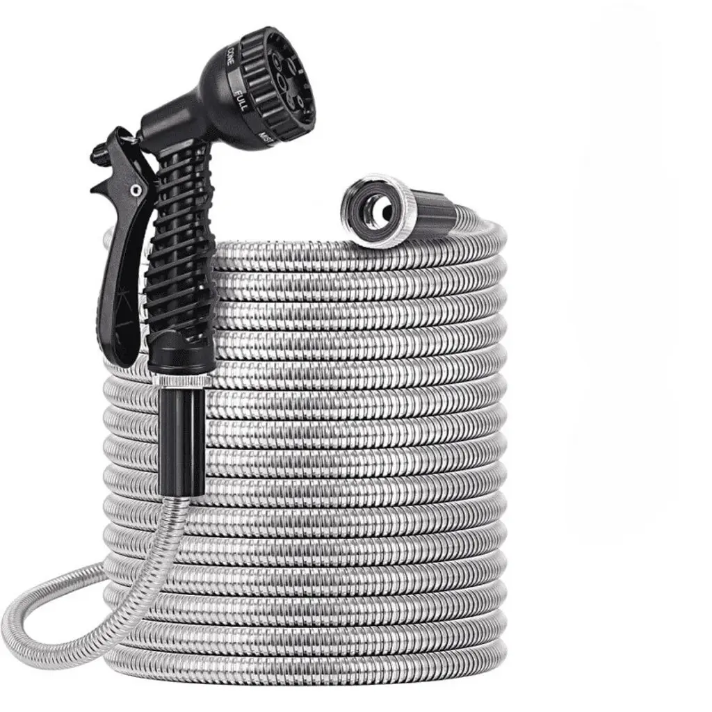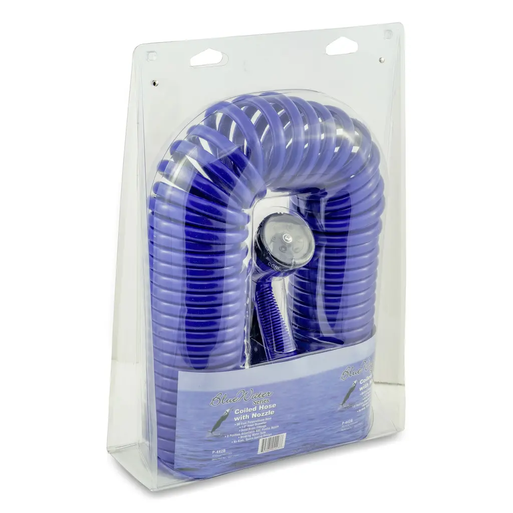 Blue Coiled Hose with Adjustable Nozzle Features: Material: Polyurethane Hose Perfect for gardening, watering plants and flowers, washing your car and more.