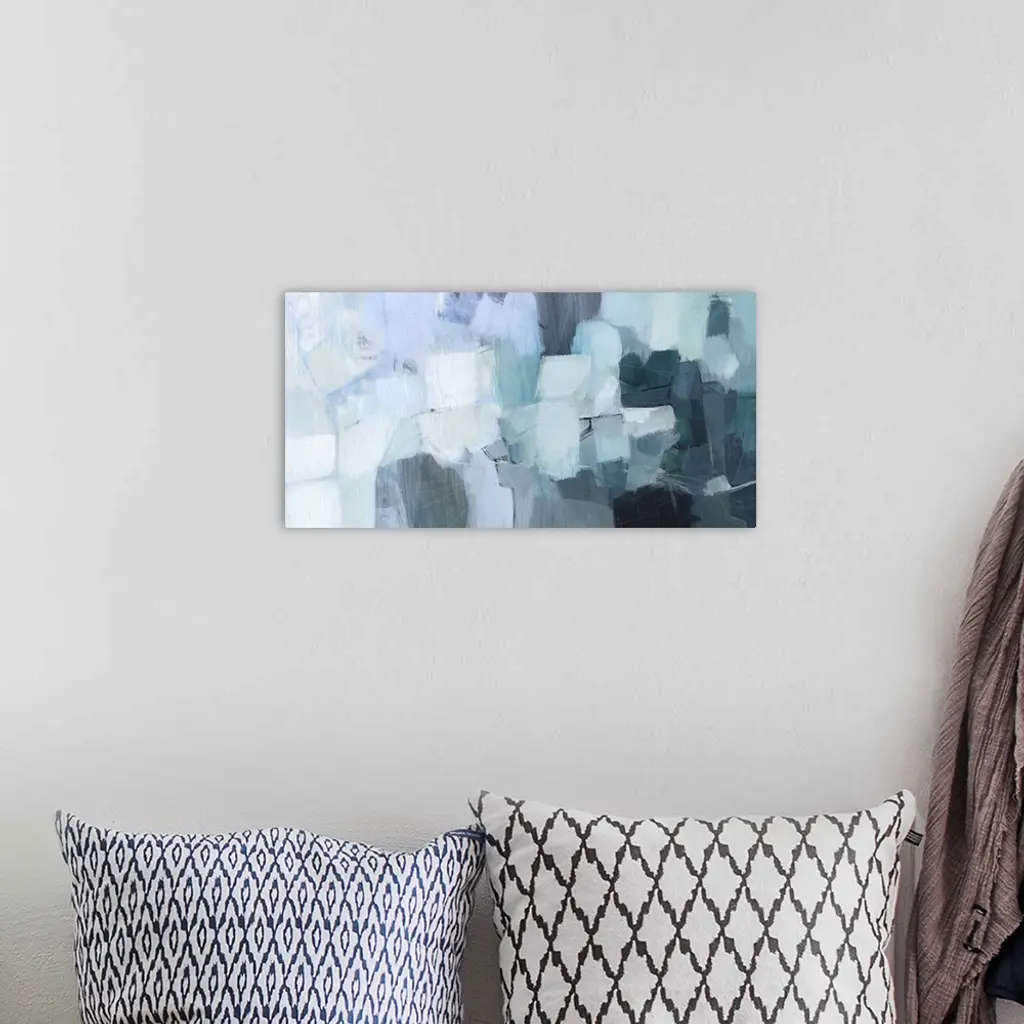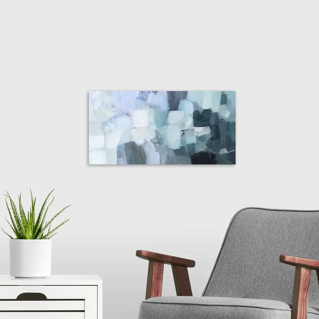 A blocky, horizontal abstract image in seaglass shades of aqua, pale grey, light blue and dark teal. It would sit perfectly in a contemporary or midcentury setting, over a sofa, fireplace or in the dining room.