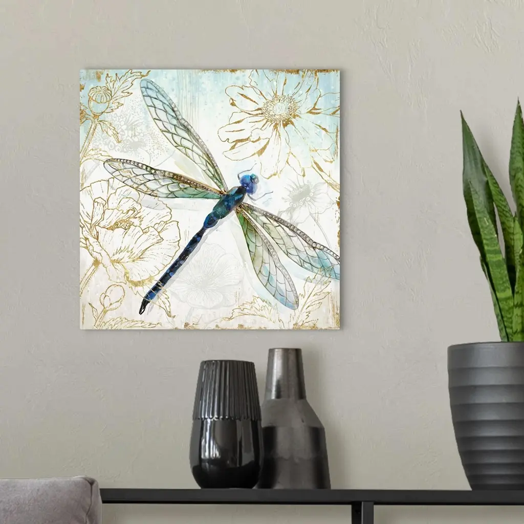 A decorative watercolor dragonfly in shades of blue and green on a floral metallic gold design.