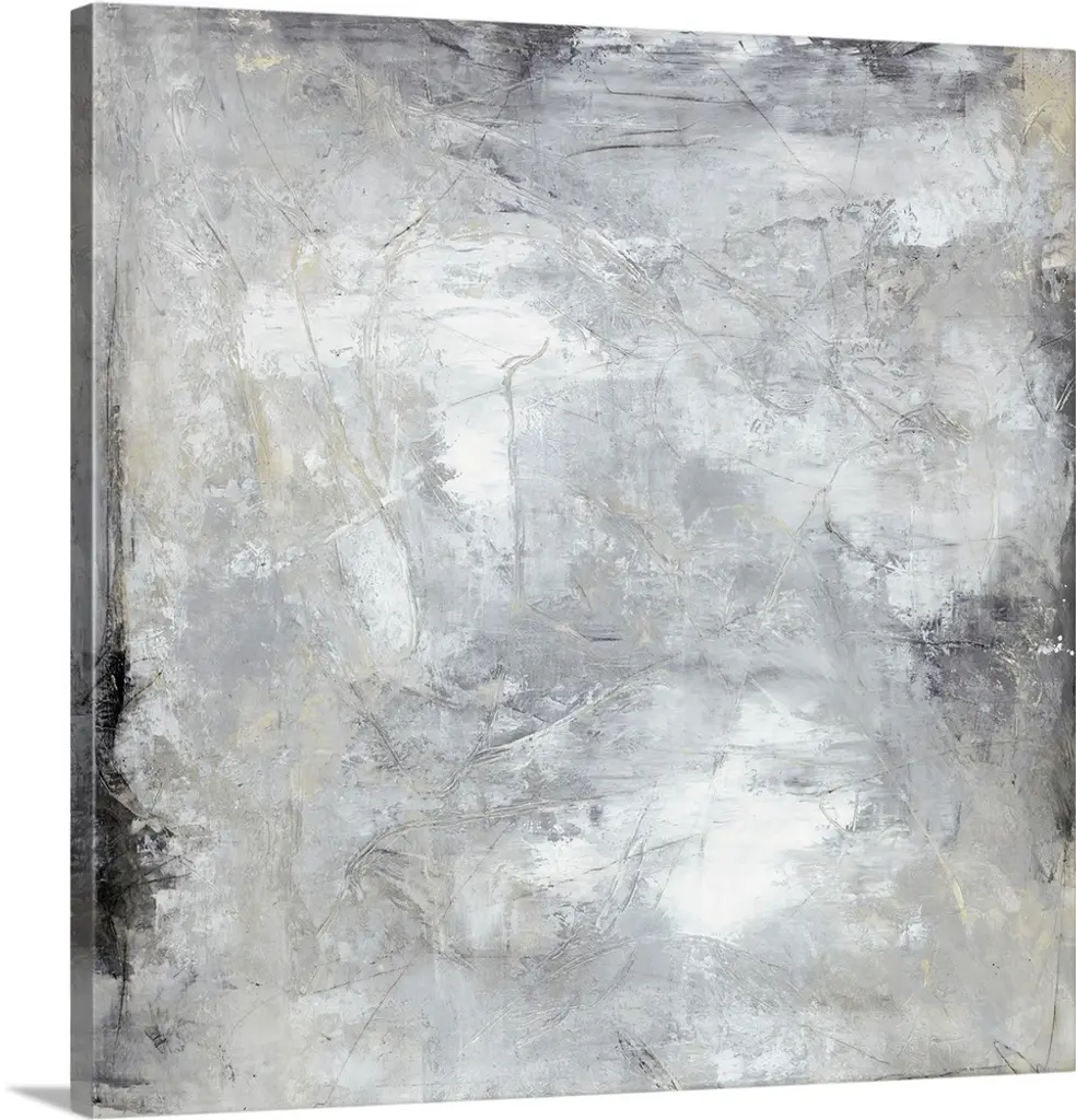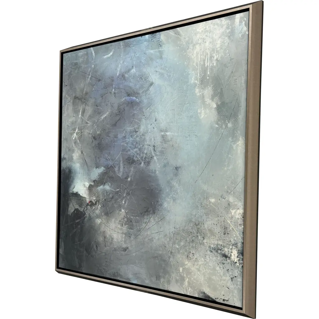 A blue and black abstract canvas features a hand applied enhanced gel finish. Canvas is mounted in a champagne gold finish floater frame.