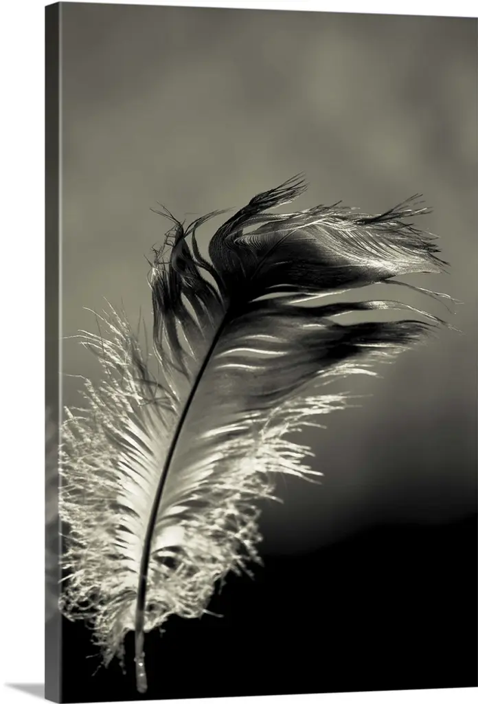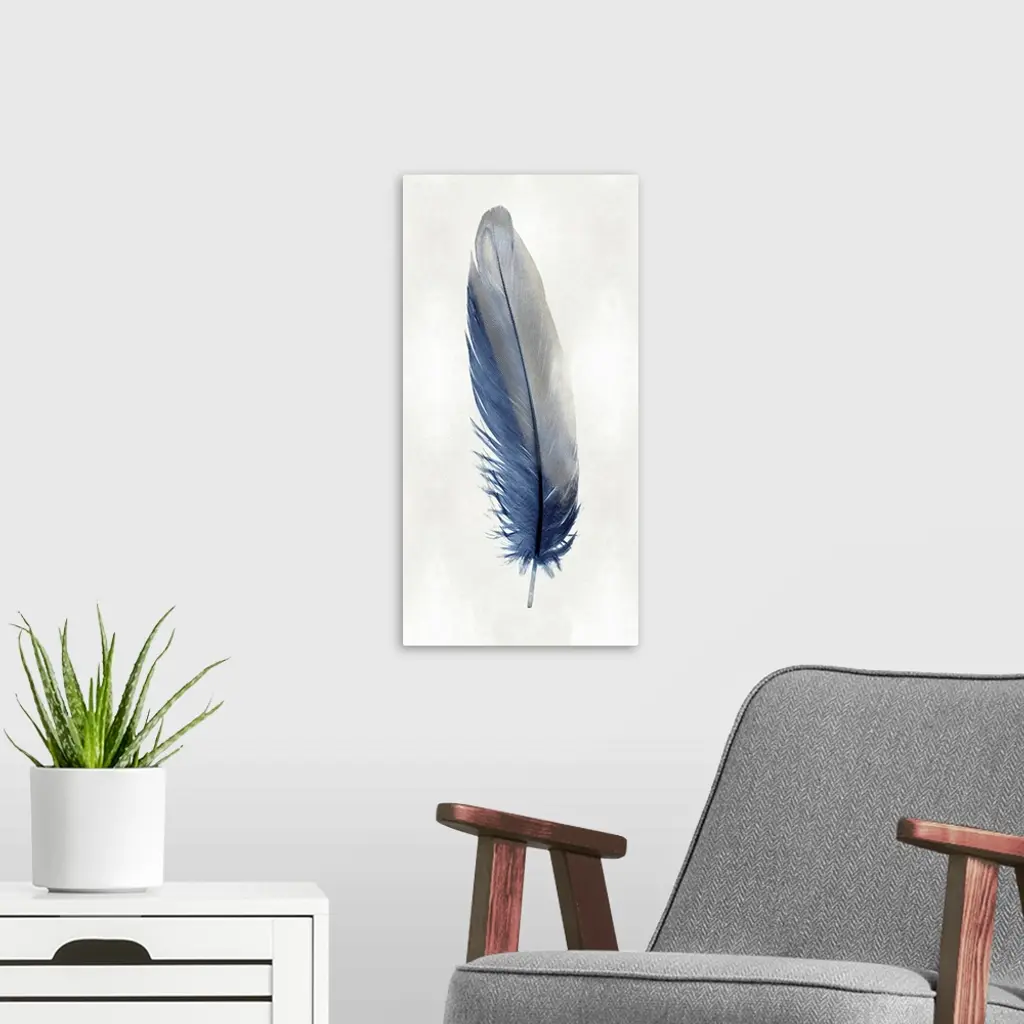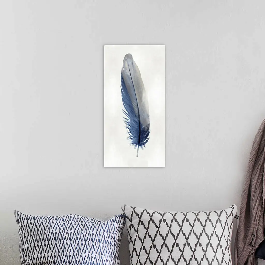 Illustration of a blue feather with metallic silver on a shiny silver background.