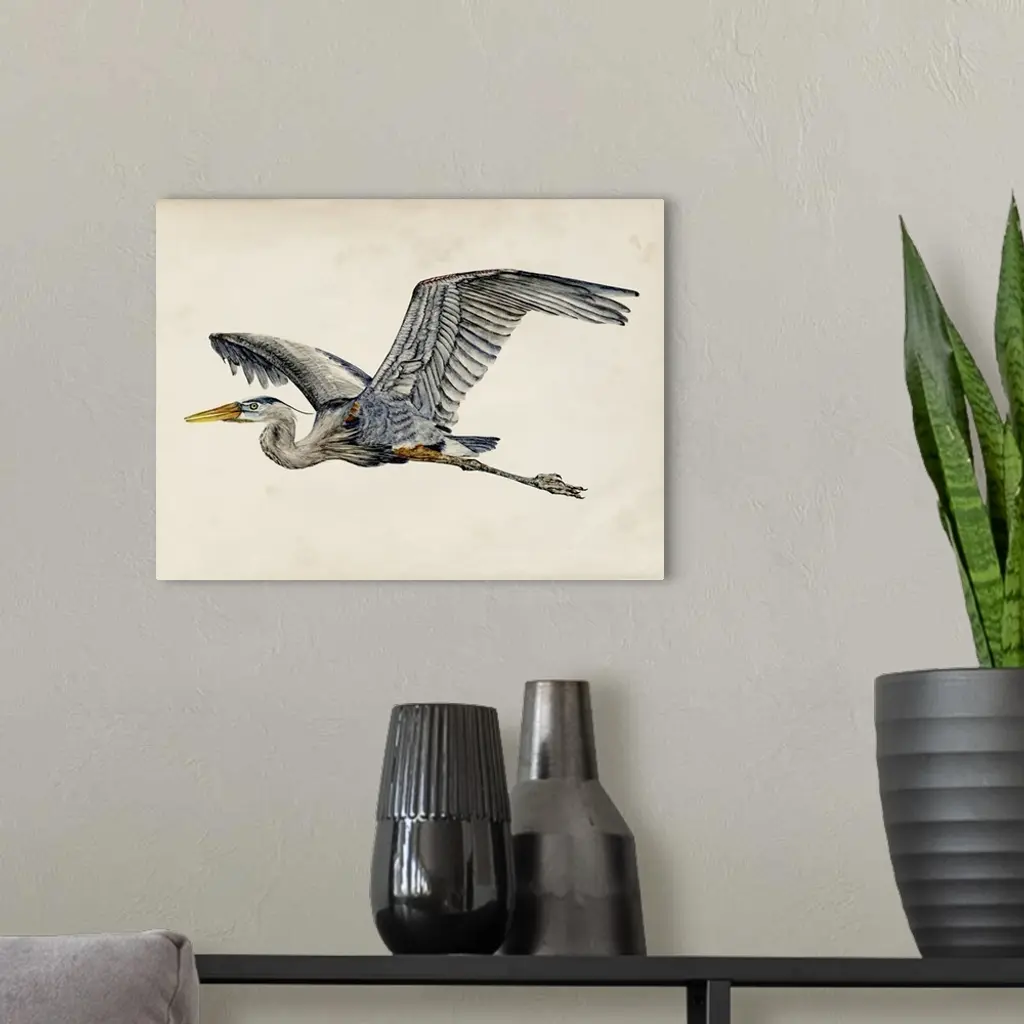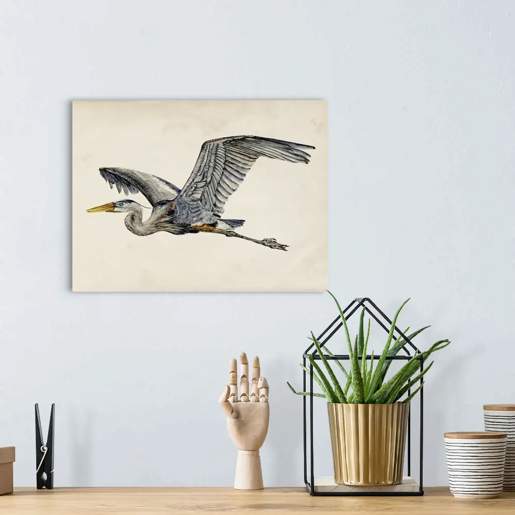 Illustration of a Great Blue Heron in flight on a parchment background.