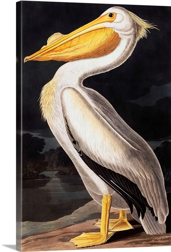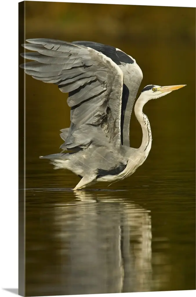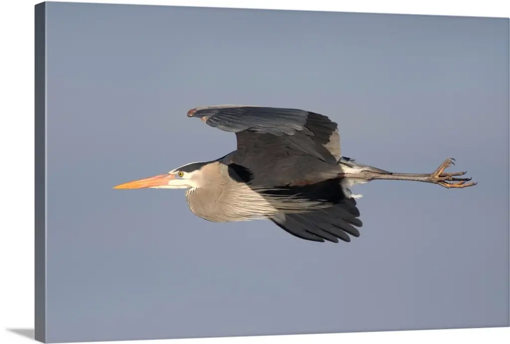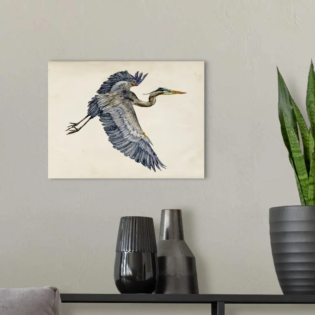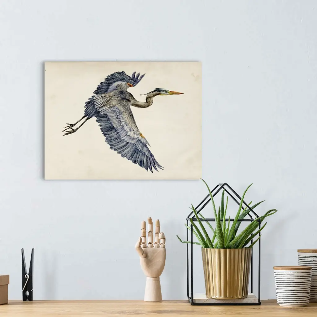 Illustration of a Great Blue Heron in flight on a parchment background.