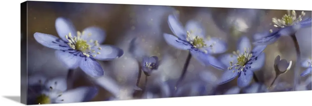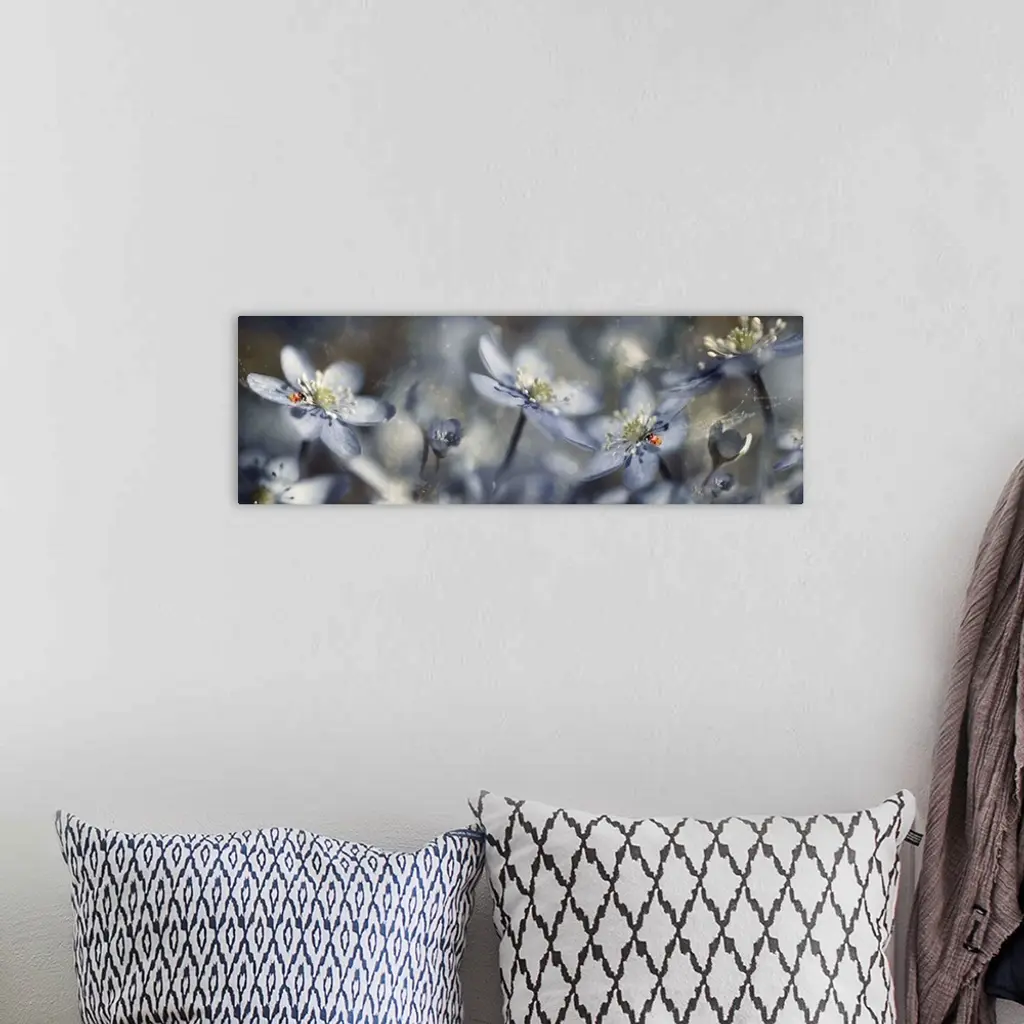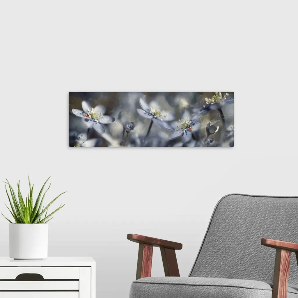 Panoramic, dreamlike image of gray-blue flowers with two ladybugs and bokeh lighting.
