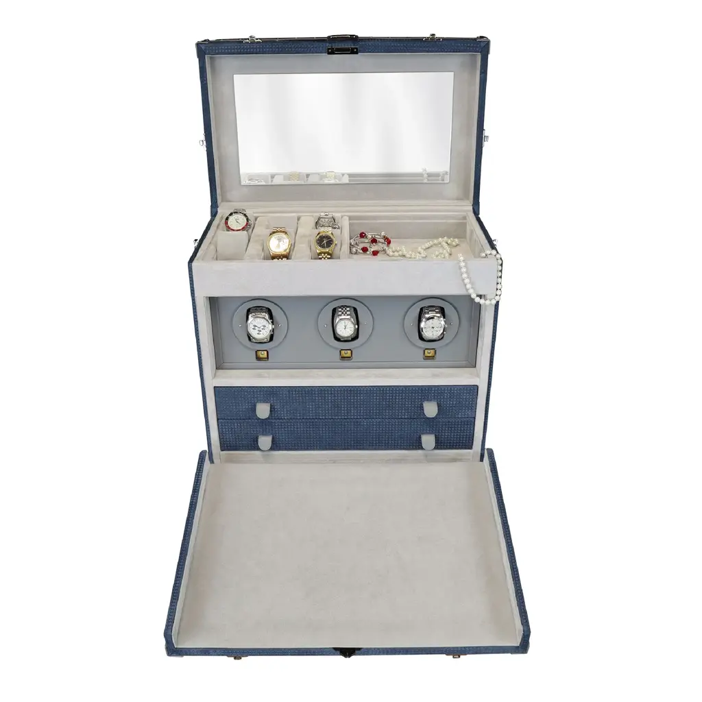 Since 1949, Agresti has crafted the pinnacle of luxury safes, trunks, and jewelry boxes in Florence, using only the finest materials, including full-grain leather, exotic woods, and textures like shagreen. As the premier name in high-end, custom solutions for safeguarding valuables, Agresti integrates cutting-edge security features: biometric access, secret compartments, unique keys, and hidden doorseverything you see in movies, they make real. Favored in multimillion-dollar estates, yachts, and private jets. Contact us to discover more about this exceptional product. Indulge in luxury with the Blue Leather Travel Trunk from Agresti Lui. This exquisite travel trunk is crafted with polished steel accessories and a stylish blue leather exterior. Unlock the key to find three Swiss winders and jewelry drawers lined with ultrasuede for a truly opulent experience.
