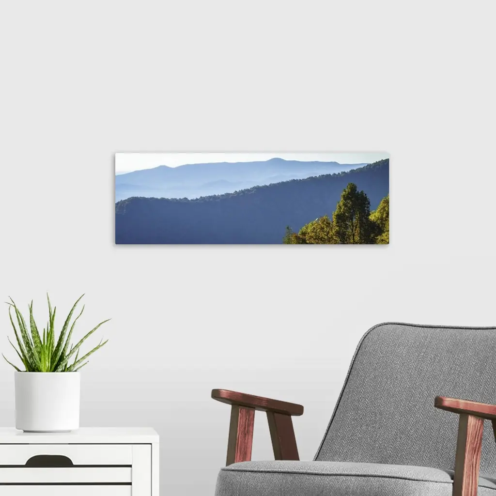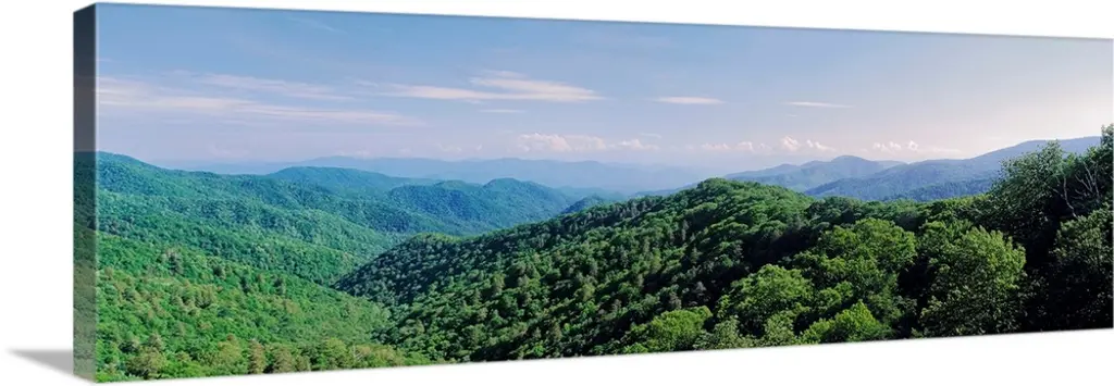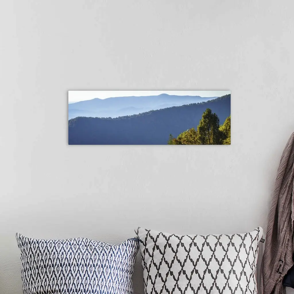 Panoramic view of the blue hills of the Smokey Mountains in North Carolina.