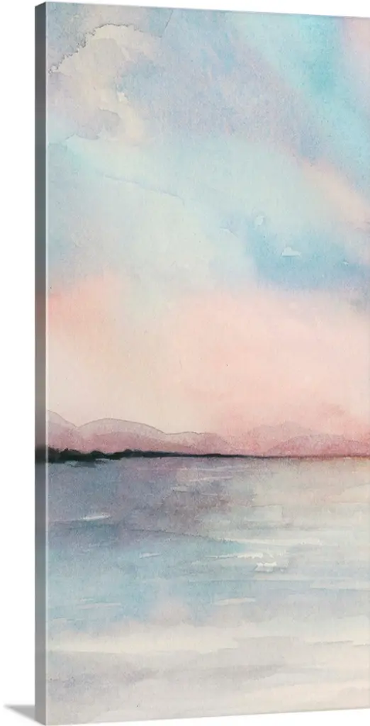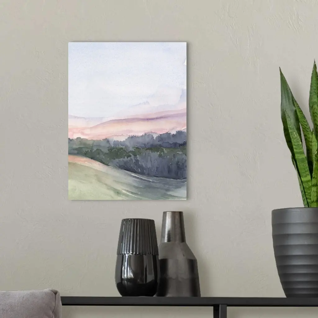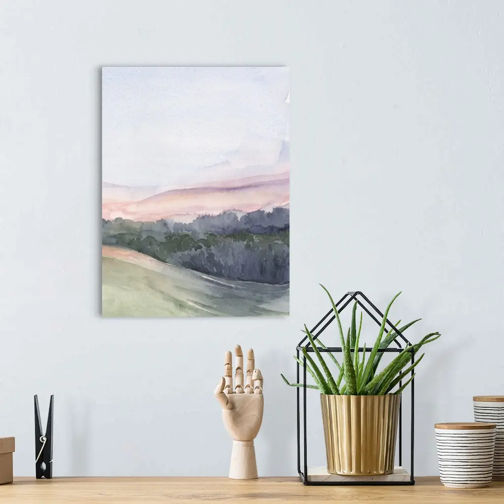 Vertical watercolor landscape of rolling hills of pink, green and blue, lined by trees with a blue sky.