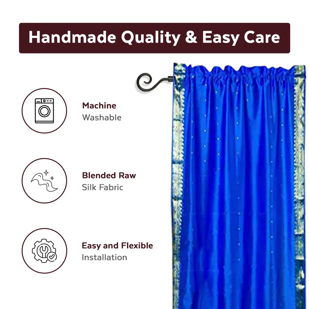 Add splendor to any room in your home with these rod pocket sari sheer curtains from India. These handmade drapes are heavily bordered with excellent artwork Sari Curtains / Drapes / Panels are the perfect choice for those looking for light, elegant drapes with a touch of luxury. It has smooth finish with a soft sheen and feels gentle and cool to the touch. Sheer curtains made of saris allow light in through windows but prevent people looking in when they are drawn. Story Behind the Art: The fabric of these curtains are weaved on a hand-loom in a small rural village in India and then hand-dyed. The artisans are a group of young hand-crafters who have moved from small villages to a big town in Central India and make various home decor items out of these exotic sari fabrics. This gives these wonderful artisans a way to have sustainable income via selling to the worldwide market on the internet. Your purchase supports local and home-based work where the artisans can easily tend to their families and pass these time-honored skills from one generation to the next.