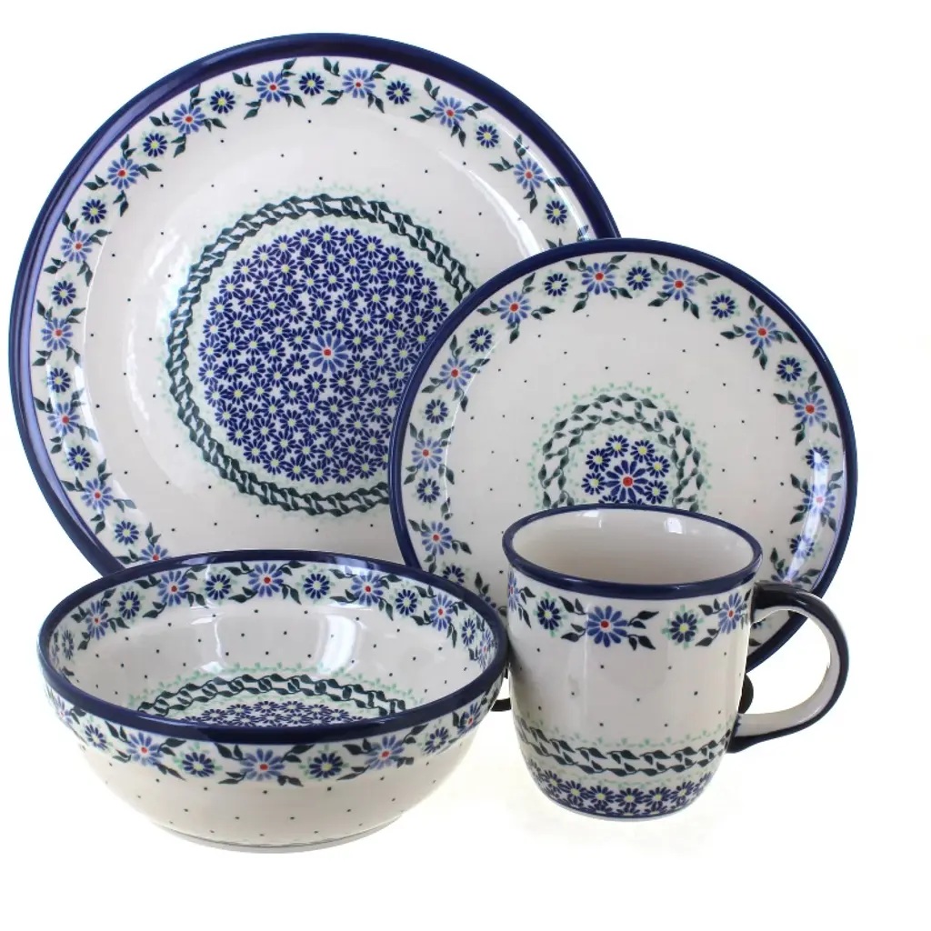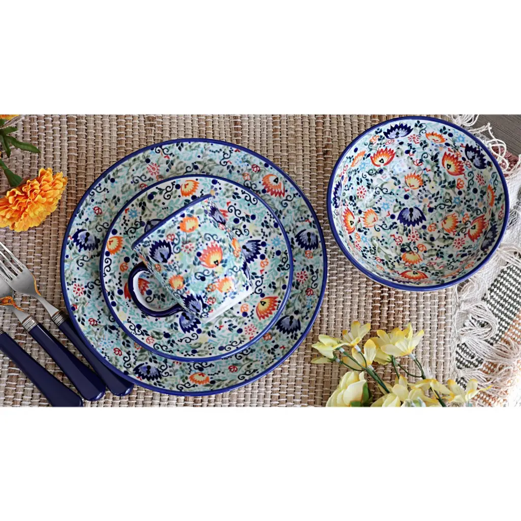 Elevate your everyday dining with this 4-Piece Polish Pottery Dinner Set, individually handmade and hand-painted by skilled artisans in Poland. Each set includes one dinner plate (10"), one dessert plate (7"), one cereal bowl (6.5" wide x 2.5" deep), and one mug (8 oz, 3.75" tall)�the perfect essentials for daily meals or gifting. What makes this set truly special is its mix-and-match versatility: choose from a variety of rich, vibrant patterns to create a personalized collection that reflects your unique style. Crafted from durable stoneware and decorated using centuries-old painting traditions, each piece is both functional and beautiful. Safe for the microwave, dishwasher, and freezer, this set is designed to transition seamlessly from casual mornings to elegant dinners. Whether starting your collection or adding to it, this 4-piece set brings authentic European craftsmanship, timeless charm, and everyday practicality to your table.