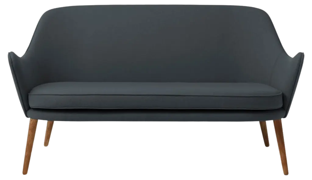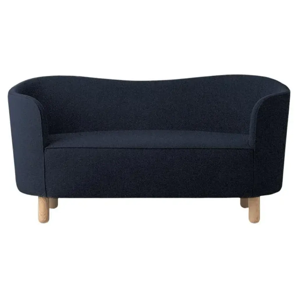 Blue Sahco zero and natural oak mingle sofa by Lassen. Dimensions: W 154 x D 68 x H 74 cm. Materials: Textile, oak. The Mingle sofa was designed in 1935 by architect Flemming Lassen (1902-1984) and was presented at The Copenhagen Cabinetmakers’ Guild Competition in the same year. It was subsequently praised for its qualities as a small but elegant sofa in the professional journal “The Architect”. Flemming Lassen loved to travel, and he was often inspired by his journeys throughout Europe. He was very taken with both Italy and France, and had a burning desire to tour those countries on his motorcycle. Flemming Lassen wanted to create a sofa made for conversation with a comfort that invited people to stay seated and talk together for long periods of time. The armrests were designed to encircle the sitters, generating intimacy and transforming the sofa into a cosy place to relax. Flemming Lassen took inspiration from both French elegance and modern Italian style, and transferred the trends and his own ideas to a small, upholstered sofa called Mingle. By Lassen is a Danish design brand focused on iconic designs created by Mogens and Flemming Lassen, founded by Lassens’ relatives in 2008.