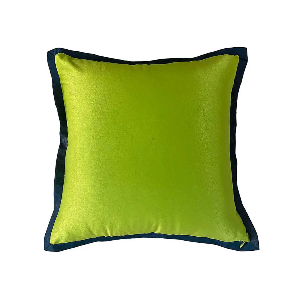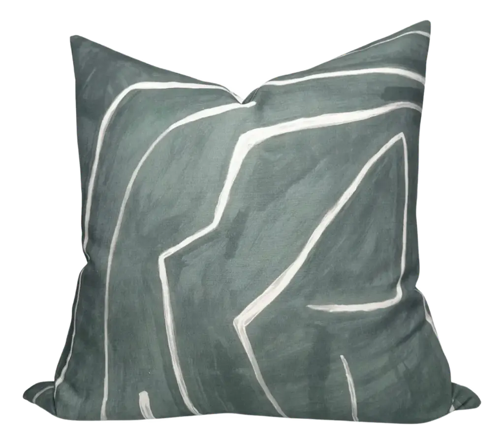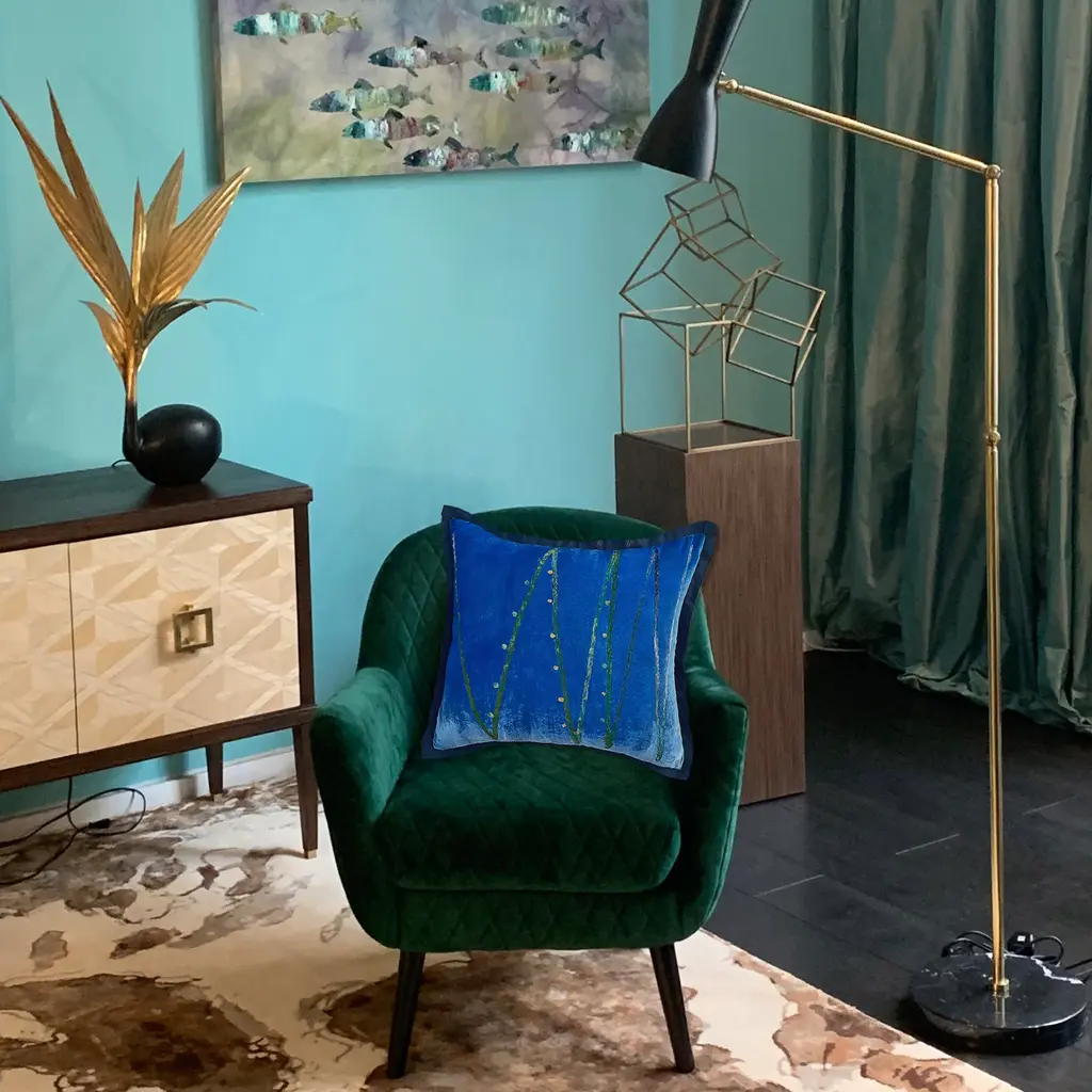 This silk velvet cushion is a captivating work of art, showcasing a bold combination of colors and a luxurious texture. The silk velvet base is a mesmerizing blend of cornflower blue and green, creating a vibrant and dynamic backdrop. On this canvas, the artist has masterfully hand-painted motifs in shades of green, with delicate white nuances that add depth and three-dimensionality to the design.