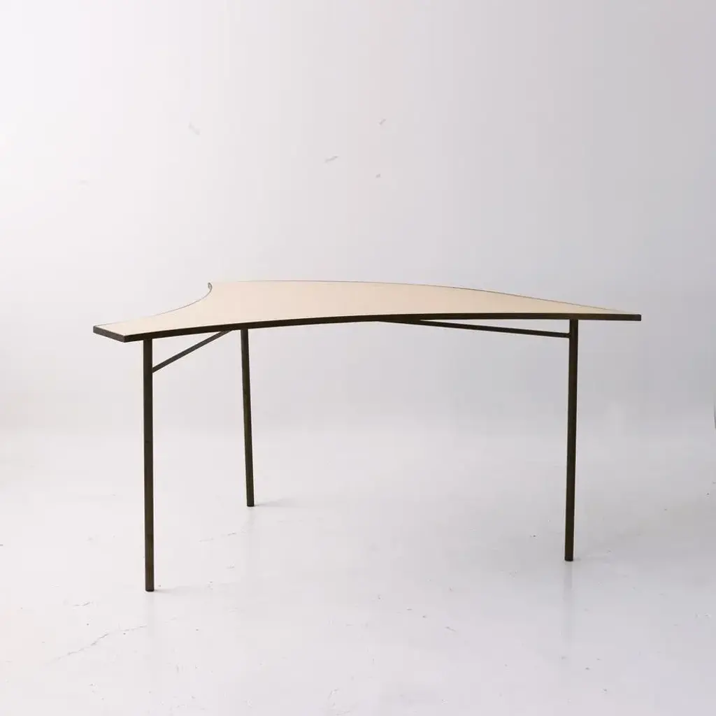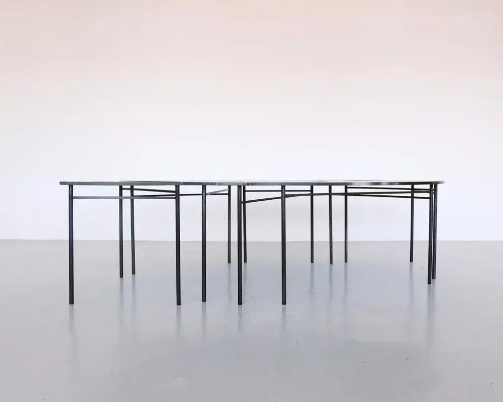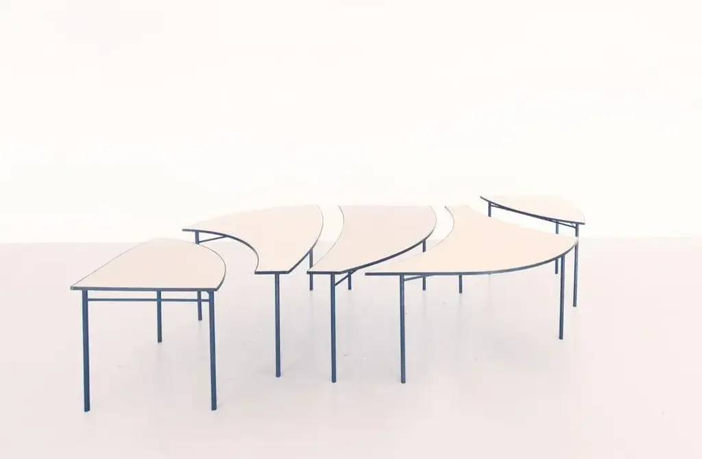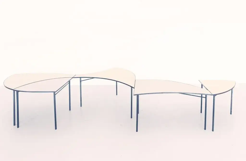 Blue tabula [non] rasa table set by studio traccia dimensions: w 280 x d 140 x h 74 cm materials: steel. The table was designed for our installation called tabula[non]rasa developed for milan design week 2021, with the intent of materializing the potential of circularity through the lens of food waste. It is realized in recycled steel and a special table top material made of food scraps. The material of the table top was developed by mogu, using a bio-based resin and low-value biomass, such as corn crops, rice straw, spent coffee grounds, waste algae and shells. The design of the table was conceived within the idea of working on modularity while yet shaping something elegant, playful and able to generate unexpected interactions. The pieces can be assembled all together to form a large leaf-shaped table, or can be arranged in creative combinations, to suit different needs, to display objects in a shop, for an exhibition or in a house. The whole table tells a story of circularity: innovative materials crafted into beautiful objects describe a new possible paradigm where resources are not depleted, but reinvested into a new metabolic loops. A new materialism that invents new narratives and form the common ground of our renewed relationships with the planet. And even more than that, a table of discussion that makes visible, the invisible flows of waste, not in a condescending way but with a positive proposal where different and circular logics are actually possible.