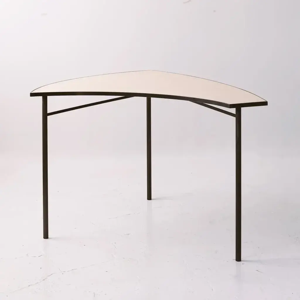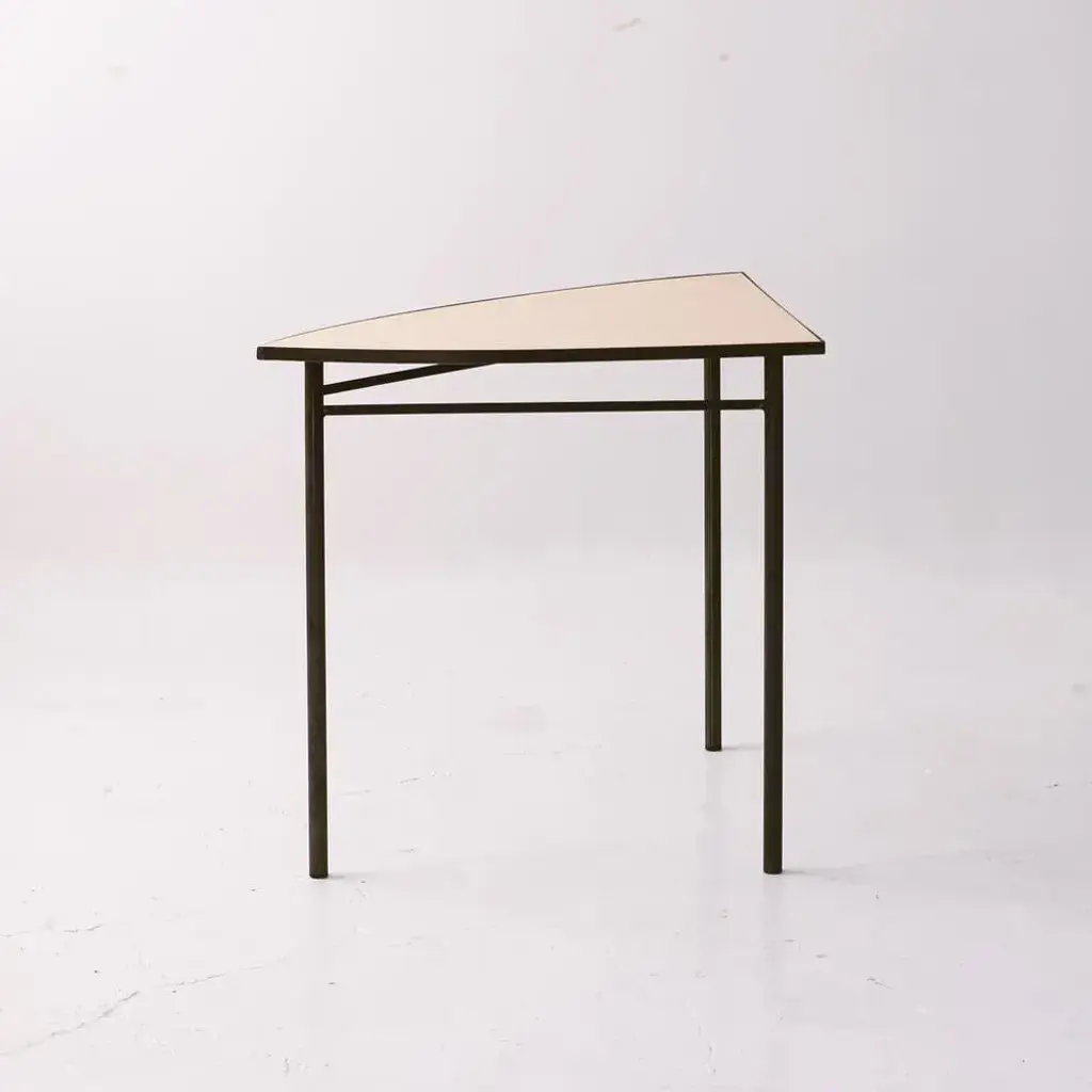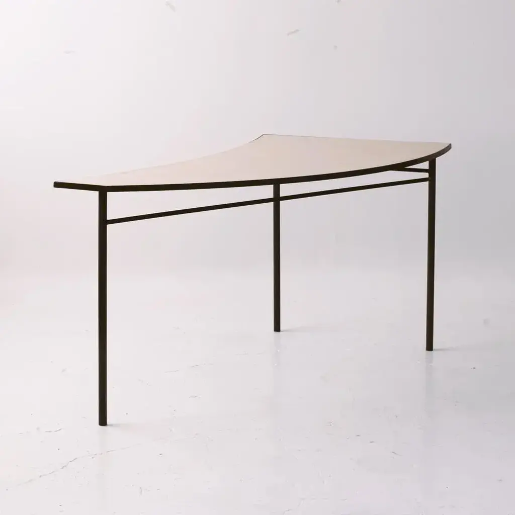 Blue tabula [non] rasa table set by studio traccia dimensions: w 280 x d 140 x h 74 cm materials: steel. The table was designed for our installation called tabula[non]rasa developed for milan design week 2021, with the intent of materializing the potential of circularity through the lens of food waste. It is realized in recycled steel and a special table top material made of food scraps. The material of the table top was developed by mogu, using a bio-based resin and low-value biomass, such as corn crops, rice straw, spent coffee grounds, waste algae and shells. The design of the table was conceived within the idea of working on modularity while yet shaping something elegant, playful and able to generate unexpected interactions. The pieces can be assembled all together to form a large leaf-shaped table, or can be arranged in creative combinations, to suit different needs, to display objects in a shop, for an exhibition or in a house. The whole table tells a story of circularity: innovative materials crafted into beautiful objects describe a new possible paradigm where resources are not depleted, but reinvested into a new metabolic loops. A new materialism that invents new narratives and form the common ground of our renewed relationships with the planet. And even more than that, a table of discussion that makes visible, the invisible flows of waste, not in a condescending way but with a positive proposal where different and circular logics are actually possible.